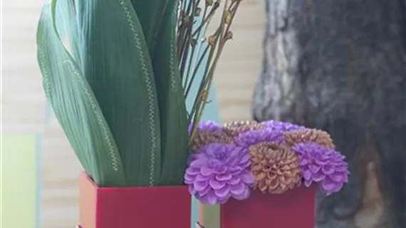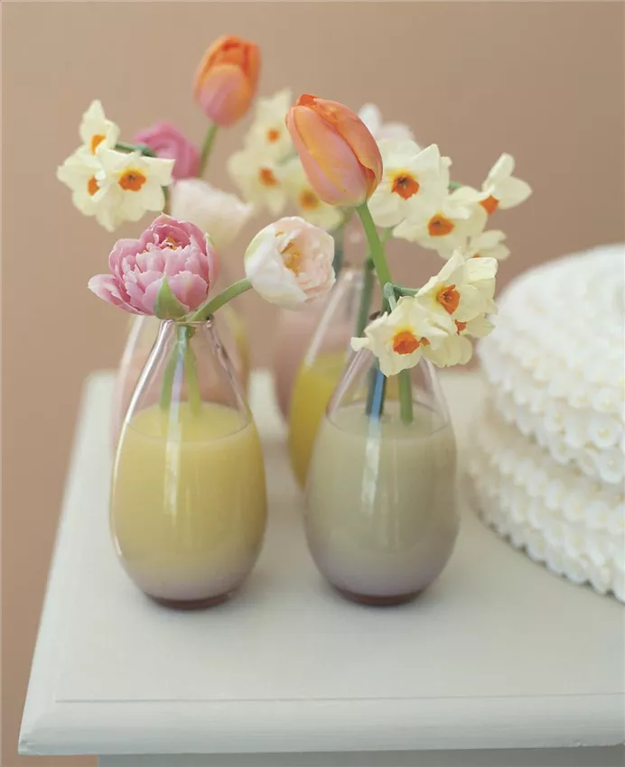 • Entscheiden Sie sich erst für das Gefäß und suchen Sie sich dann passend zu Form und Farbe die Blumen aus