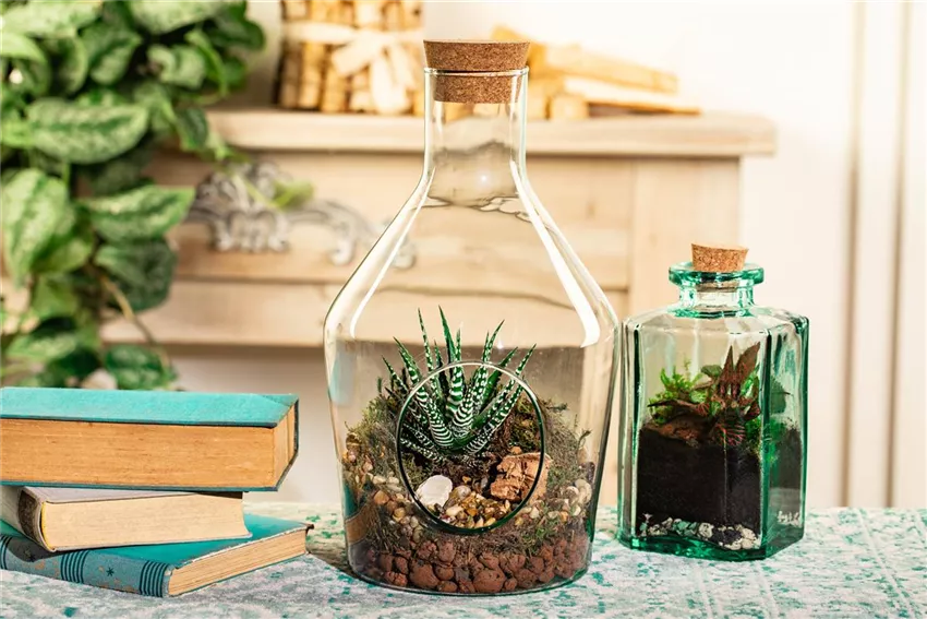 Soweit die Theorie, aber wie legt man denn einen Flaschengarten richtig an, damit ein solches funktionierendes Ökosystem entstehen kann? Zuerst benötigen Sie eine große Glasflasche oder auch ein anderes luftdicht verschließbares Glasgefäß. Je größer dieses Gefäß ist, desto besser, denn auch wenn die Pflanzen zuerst klein sind, werden sie unter den guten Wachstumsbedingungen, die in dem Glas herrschen, prächtig wachsen. Dies macht es auch notwendig, dass Sie sich auf wenige Pflanzen beschränken.