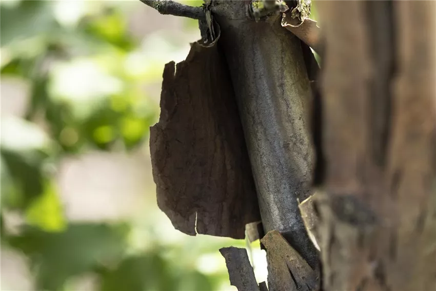 Herrscht strenger Frost und gleichzeitig Sonnenschein, sind Baumstämme von Frostrissen bedroht. Durch hohe Temperaturunterschiede entsteht Spannung in der Rinde und diese kann platzen. Die entstehenden Wunden sind ideale Eintrittspforten für Pilze und andere Schädlinge. Am gefährdetsten sind junge Bäume mit noch glatter Borke. Um dem vorzubeugen, sollte man den Stamm schattieren. Dafür nimmt man eine Schilfmatte oder Jutegewebe, oft reicht auch ein einfaches Brett, das man gegen die Südseite des Stammes lehnt. Haben Sie mehrere Bäume, ist ein anstreichen mit Schutzfarbe die beste Lösung, diese erhalten Sie im Fachhandel.