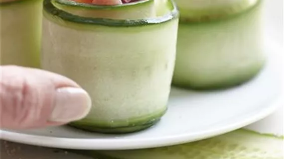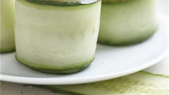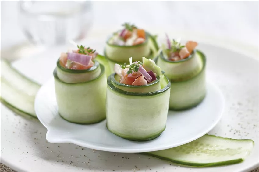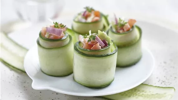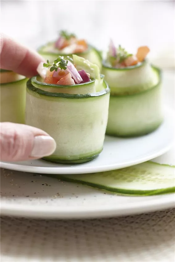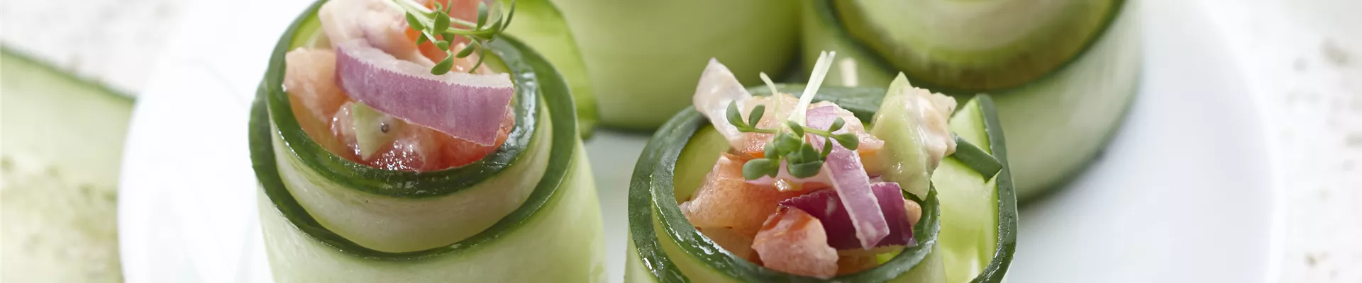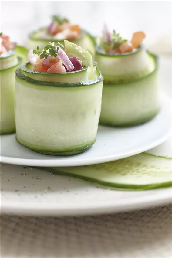 Mit Salz und Pfeffer abschmecken. Die Gurkenstreifen auf einem Teller zu vier Röllchen aufstellen. Dann die Joghurt-Masse in die Röllchen füllen und mit Kresse garnieren.