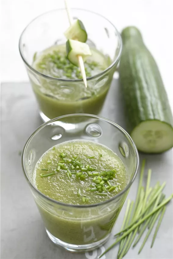 Den Gurkenshake in 2 Gläser füllen. Den Schnittlauch in Ringe schneiden und den Shake damit garnieren. Dann noch die restlichen Gurkenstücke auf 2 kleine Spieße stecken, auf die Gläser legen und servieren.