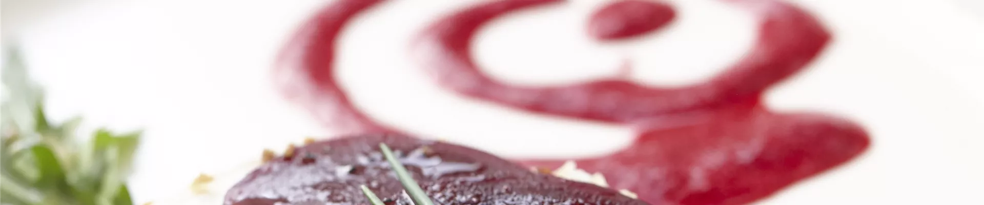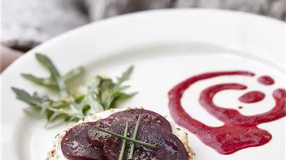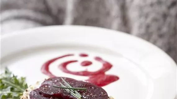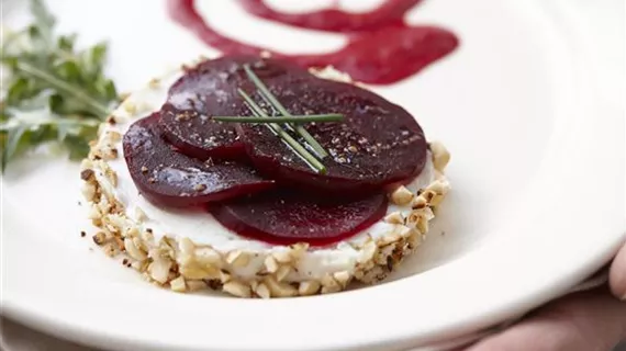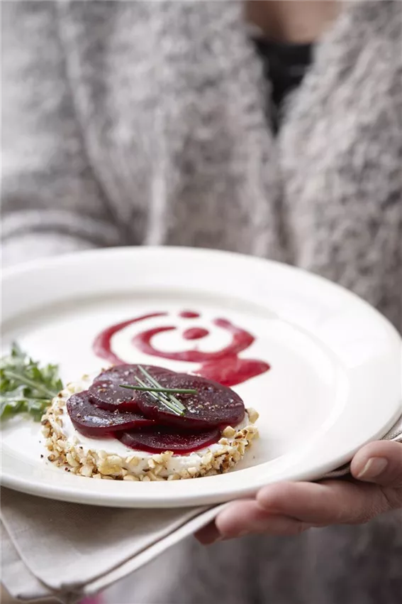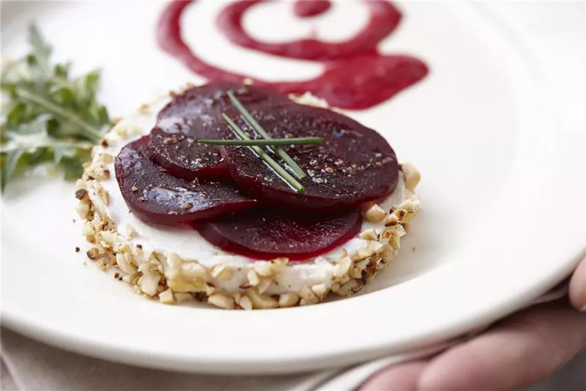 Rote Beete in Scheiben schneiden. Die Haselnüsse in einer Pfanne braun anrösten und dann auskühlen lassen. Ziegenkäse in 4 Scheiben schneiden, mit dem Rand durch die Haselnüsse rollen und jeweils auf einem Teller anrichten.