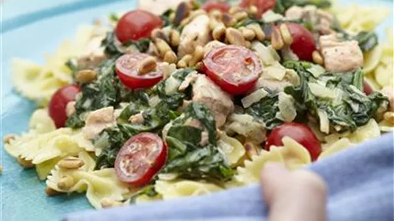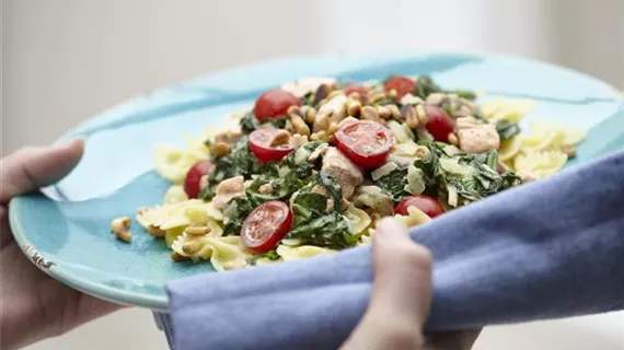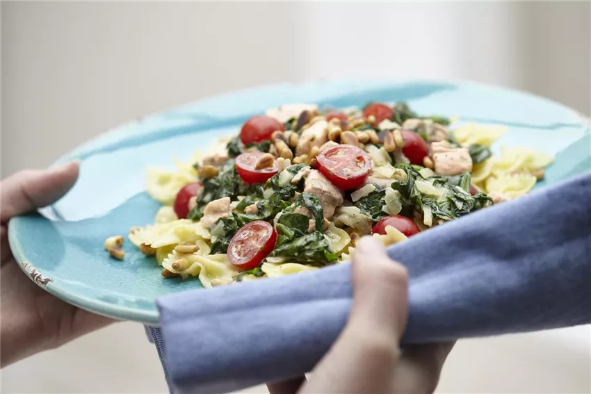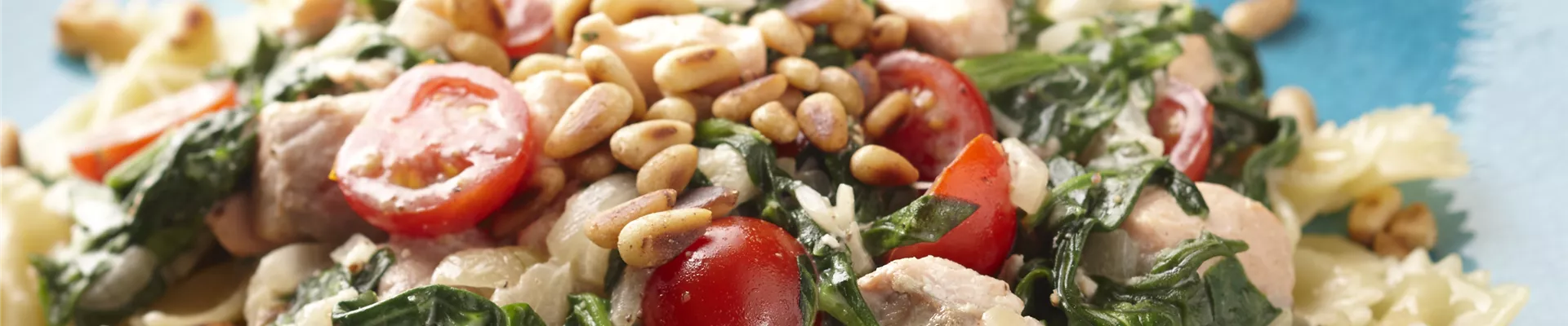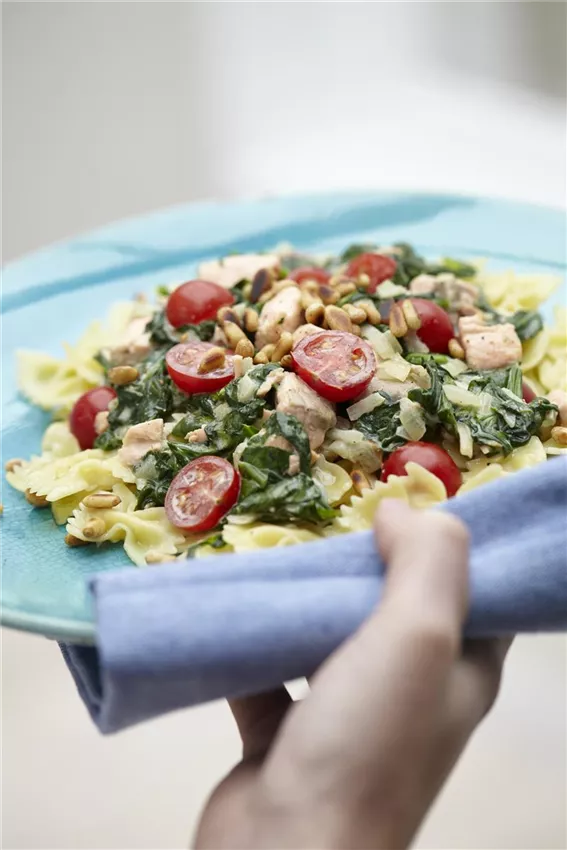 Tomaten waschen, halbieren, dann in den Wok geben und 4 Minuten mitköcheln lassen. Die Farfalle ebenfalls kurz mitbraten und alles auf einem Teller anrichten. Zum Garnieren noch mit den Pinienkernen bestreuen.