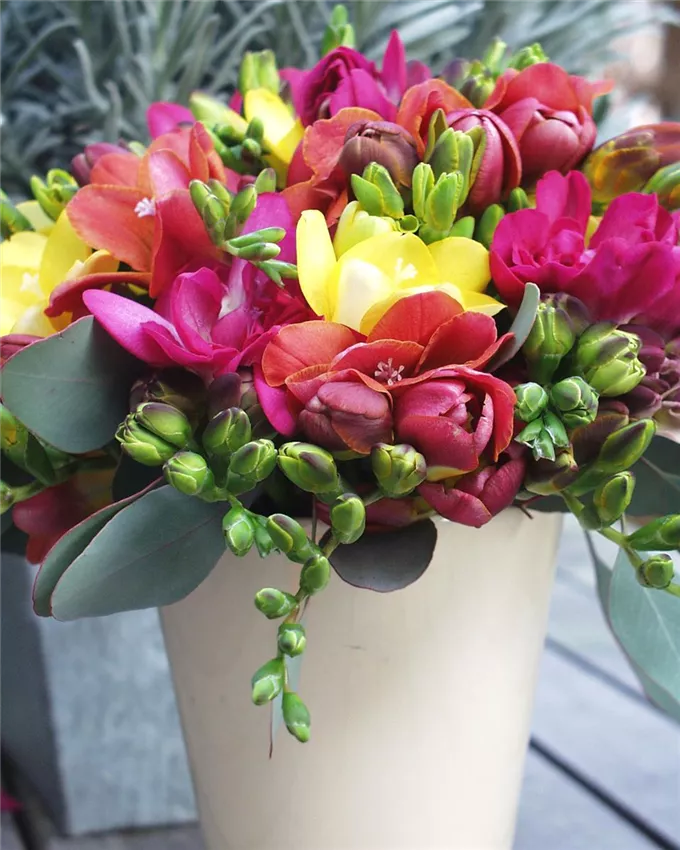 Den Namen Iris (= Regenbogen) erhielt diese Gattung ihrer schillernden Blütenfarben wegen. Ihre Vertreter haben reizvolle, charakteristisch geformte und schön gefärbte Blüten auf hohen, schlanken Stielen mit einer durchschnittlichen Höhe von 50-60 cm. Dank ihrer besonders langen Haltbarkeit avancieren die Iris zu gefragten Schnittblumen. Am schönsten sehen sie in Sträußen zusammen mit anderen Schnittblumen aus. Die Knospen dürfen beim Kauf noch nicht geöffnet sein.
