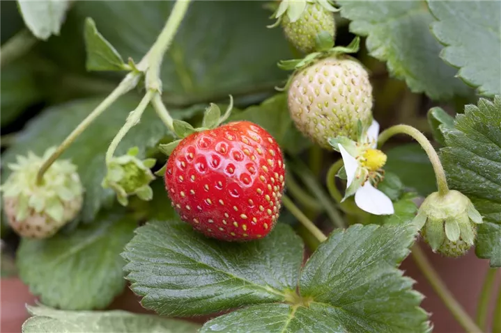 Die Erdbeere 'Mieze Schindler' (Fragaria x ananassa) bildet rote, kleine Beeren. Diese sind süß, aromatisch im Geschmack. Für eine ertragreiche Ernte ab Juli schaffen durchlässiger, humoser Boden und ein sonniger Standort optimale Bedingungen. Auch ihre weißen Blüten sind eine schöne Erscheinung.