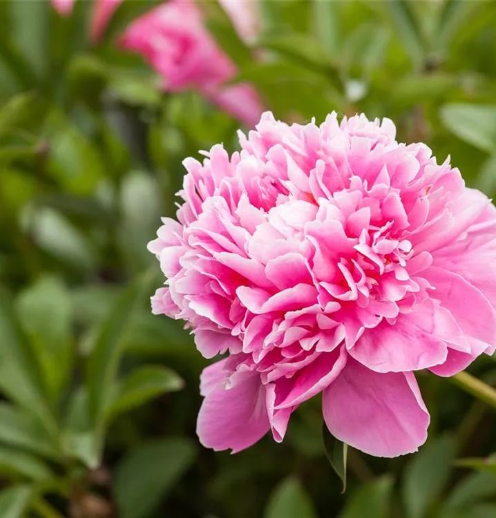 Die Garten-Pfingstrose, rosa (Paeonia lactiflora) ist eine aufrechte, ausladend wachsende Staude, die von Mai bis Juni rosafarbene, schalenförmige Blüten mit einem angenehmen Duft bildet. An einem sonnigen Standort mit humosem, nährstoffreichem, lehmigem Boden erreicht sie gewöhnlich eine Höhe von ca. 1 m und wird ca. 1 m breit. Die Garten-Pfingstrose, rosa ist gut frostverträglich.
