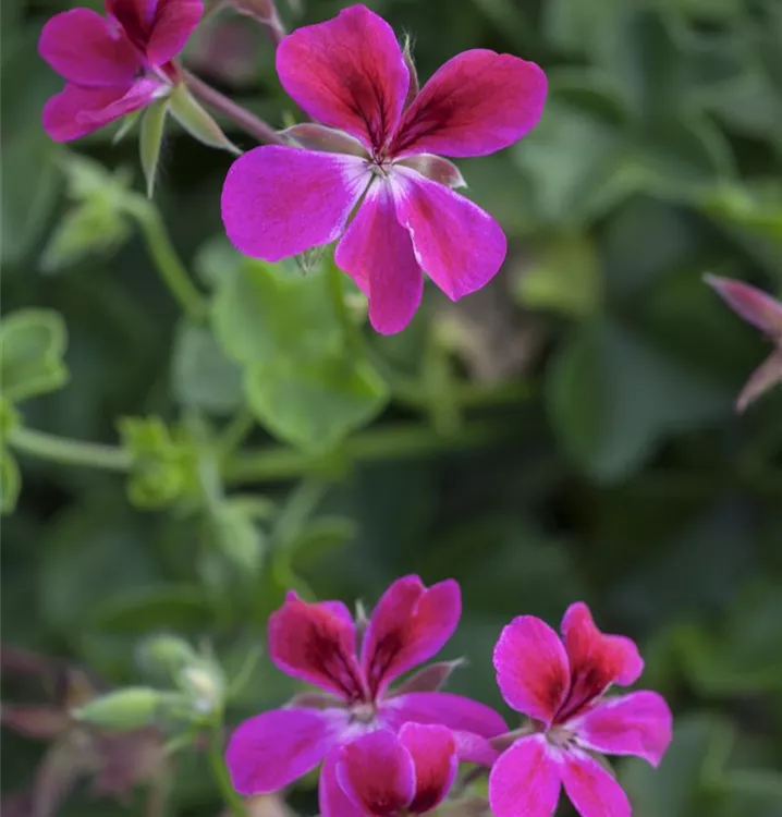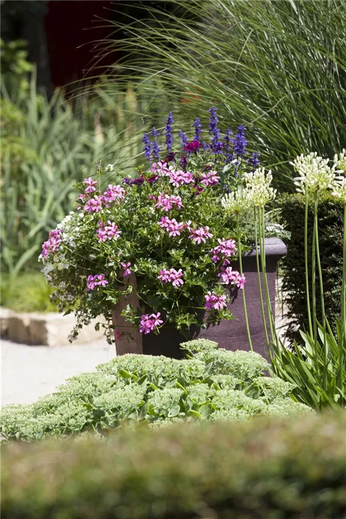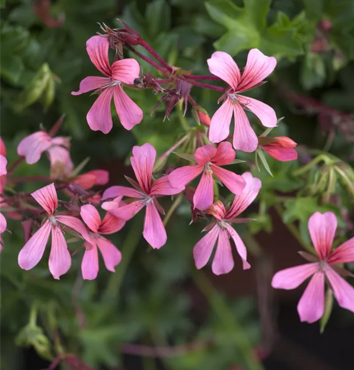 Die Hängegeranie (Pelargonium peltatum) ist eine beliebte Pflanze für den Balkon. Die unzähligen Blüten erscheinen, je nach Sorte, in verschiedenen Farben die ganze Saison hindurch. Ein sonniger bis halbschattiger Standort und ein durchlässiges Substrat werden bevorzugt.