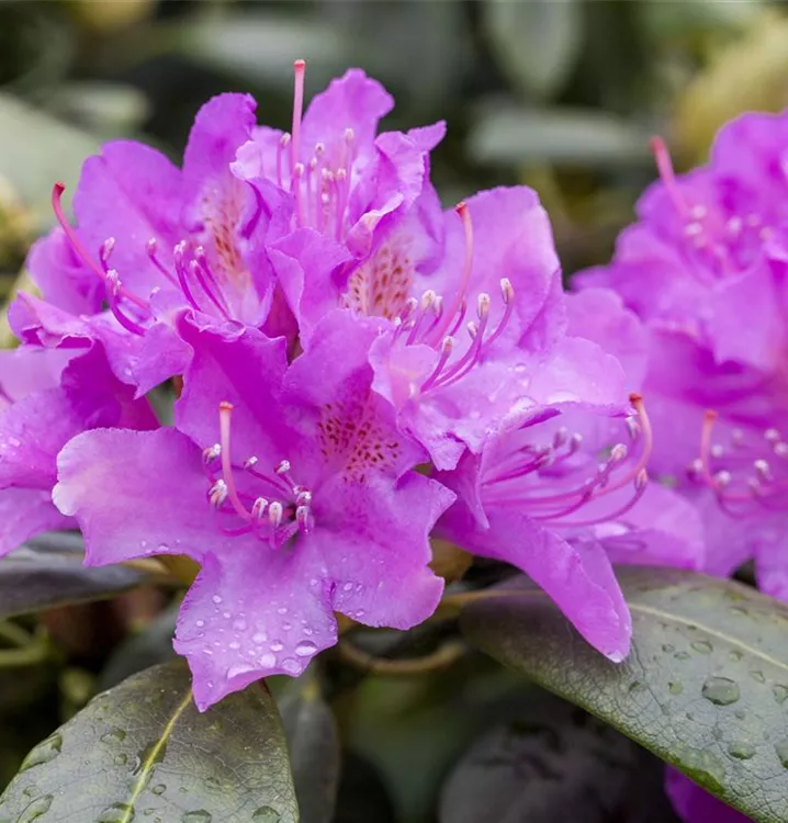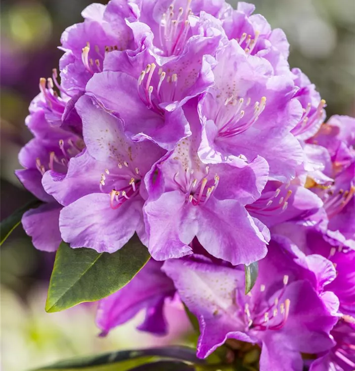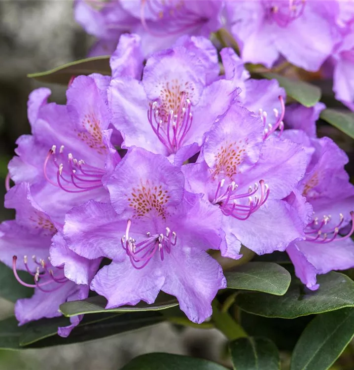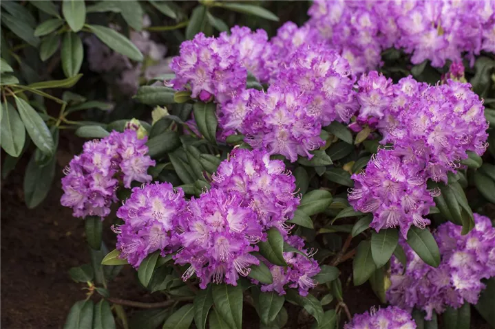 Rhododendron 'Alfred' bildet von Ende Mai bis Anfang Juni zahlreiche trichterförmige, in Dolden angeordnete, lilafarbene Blüten mit grüngelber Zeichnung auf hellem Grund.