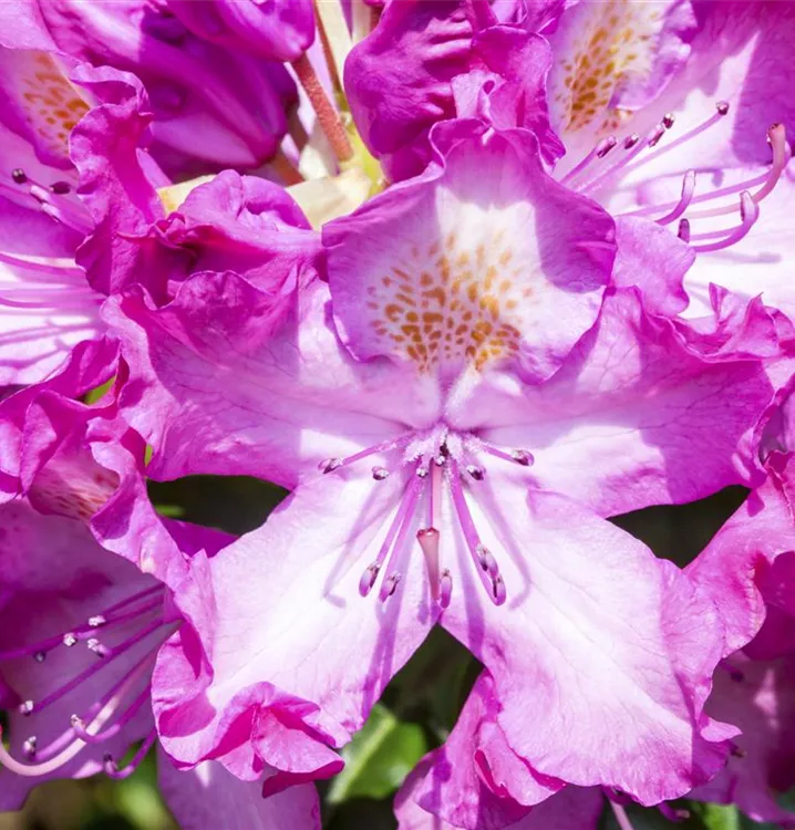 Der Rhododendron-Hybride 'Alfred' (Rhododendron) bringt von Ende Mai bis Anfang Juni ein wahres Meer aus lilafarbenen bis grüngelben Zeichnung auf hellem Grund Blüten hervor. Dieses aufrecht, breit, kugelförmig wachsende Gehölz erreicht gewöhnlich eine Höhe von 1 - 1,6 m und eine Breite von 1,5 bis 2,5 m. Ein halbschattiger (bis schattiger) Standort und ein humoser, kalkfreier Boden schaffen optimale Bedingungen für ein gesundes Wachstum. Der Rhododendron-Hybride 'Alfred' ist gut frostverträglich.