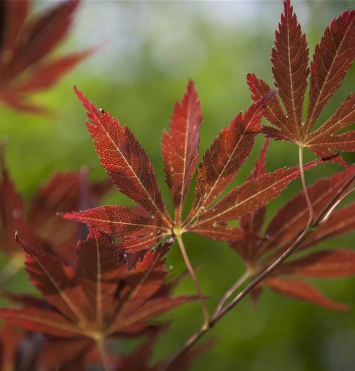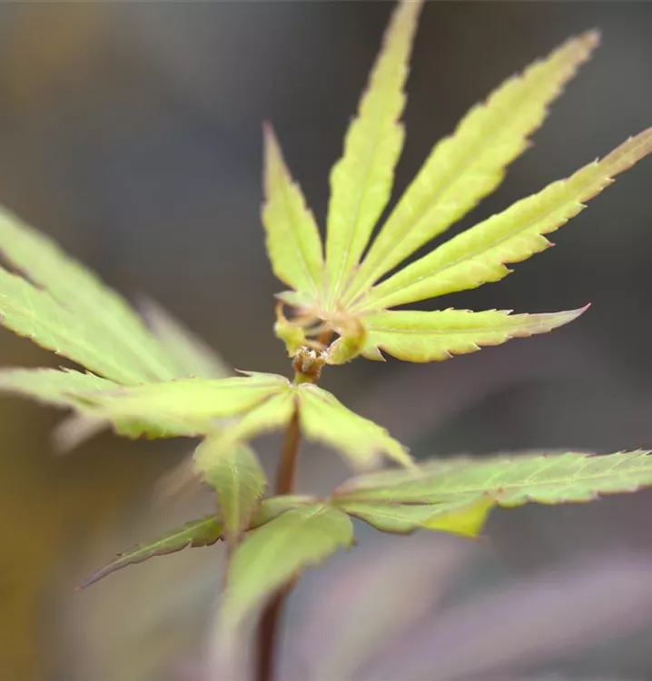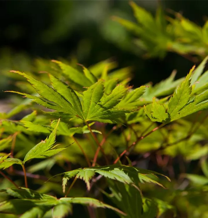 Der Fächerahorn (Acer palmatum) ein mehrstämmiger, schirmförmiger, malerischer Großstrauch, der, je nach Sorte, Blüten in verschiedenen Farben hervorbringt. An einem sonnigen bis halbschattigen, windgeschützten Standort mit durchlässigem, humosem Boden erreicht er gewöhnlich eine Höhe von ca. 7 m und wird ca. 7 m breit.