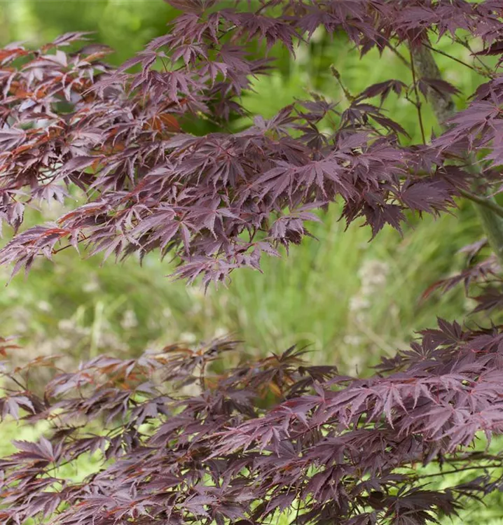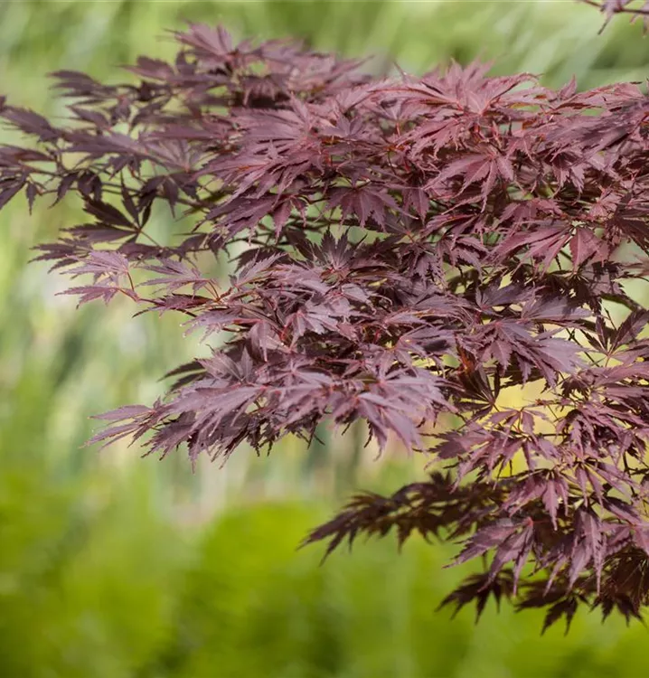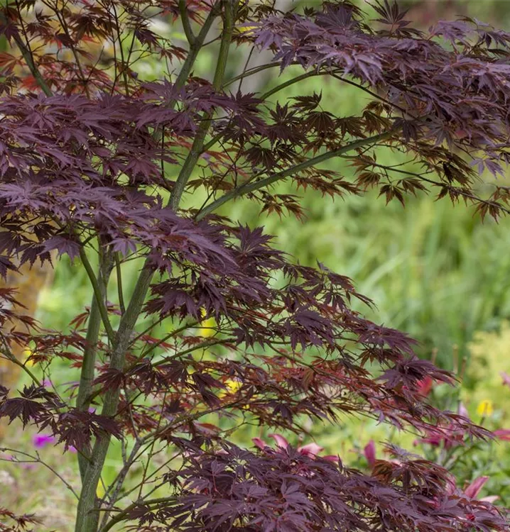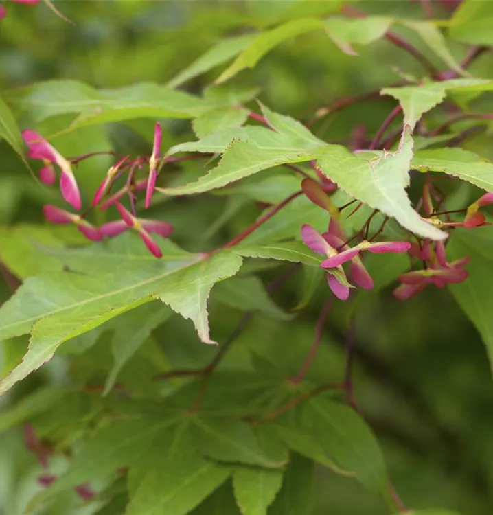 Die purpurroten Blüten des Fächerahorn erscheinen in Trauben im Mai.