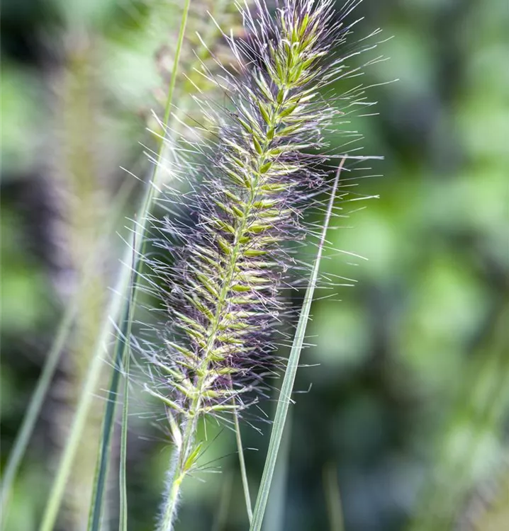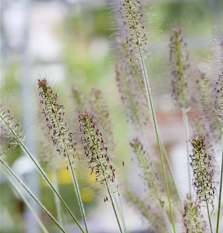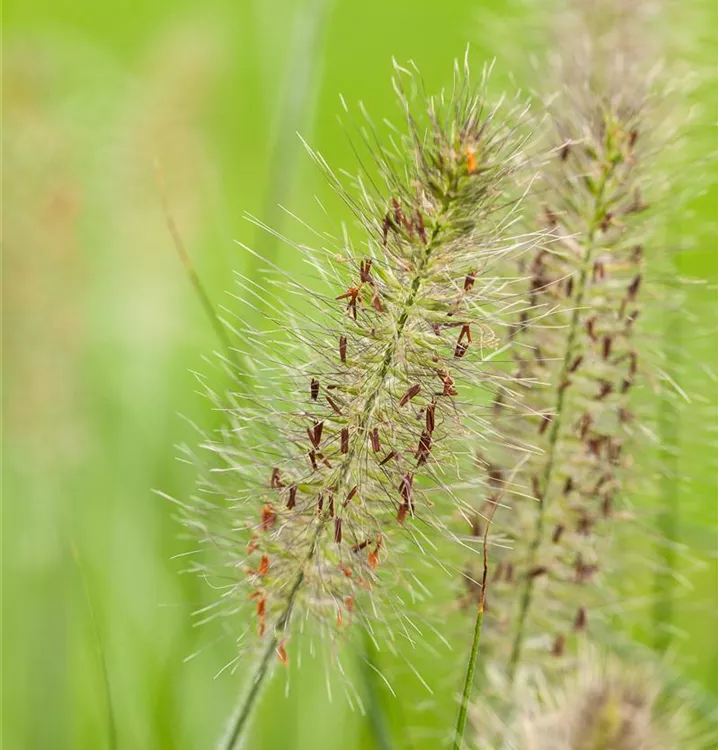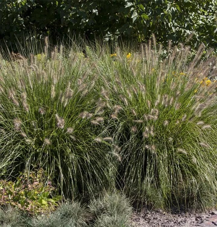 Das Garten-Federborstengras 'Hameln' (Pennisetum alopecuroides) ist mit seiner dunkelgrünen Blattfärbung ein dekoratives Gestaltungselement im Garten, welches sich an einem sonnigen Standort mit einem möglichst durchlässigen, nährstoffreichen Boden am wohlsten fühlt. Die goldgelben Blütenwedel schmücken die buschig, aufrecht und horstbildend wachsende Pflanze ab Sommer. Bei günstigen Bedingungen erreicht dieses winterharte Gras eine Höhe von ca. 35 cm und wird bis zu 30 cm breit.