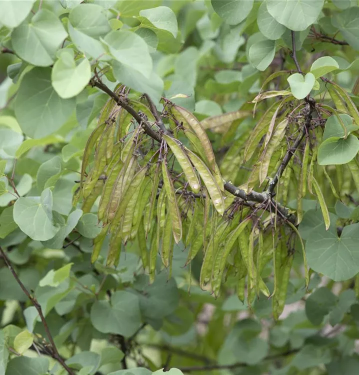 Besonders dekorativ sind die braunen Früchte von Cercis siliquastrum. Diese erscheinen ab September.