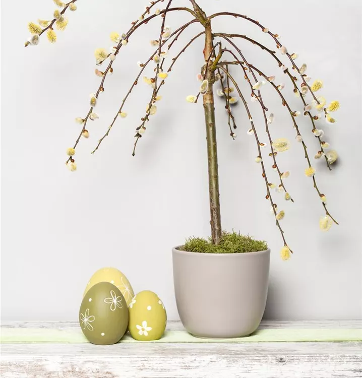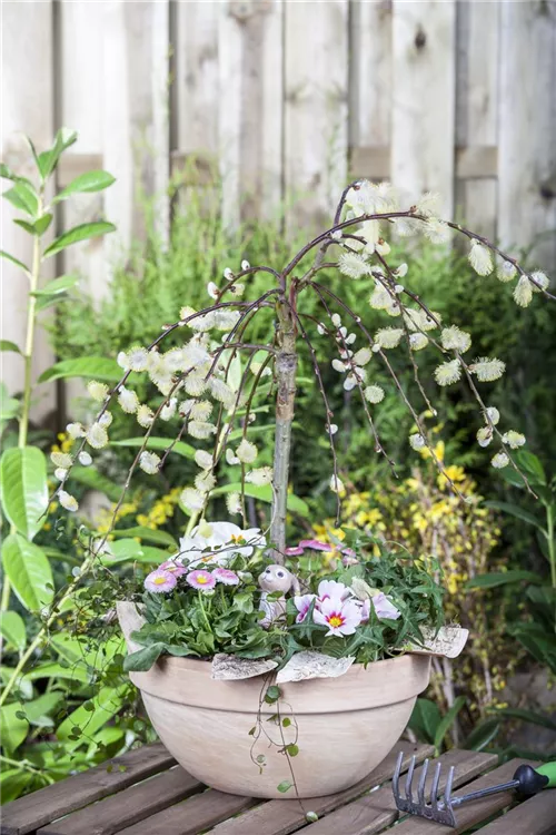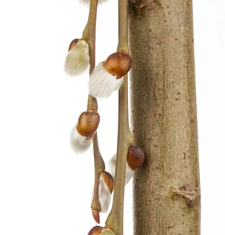 Die Hängende Kätzchenweide 'Pendula' (Salix caprea) ist ein überhängender Kleinbaum, der silbrige, in Kätzchen angeordnete Blüten mit einem leichten Duft hervorbringt. Sie erscheinen von März bis April. An einem sonnigen bis halbschattigen Standort mit durchlässigem, feuchtem bis nassem Boden erreicht sie gewöhnlich eine Höhe von ca. 1,5 m und wird ca. 1 m breit.
