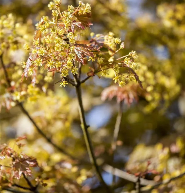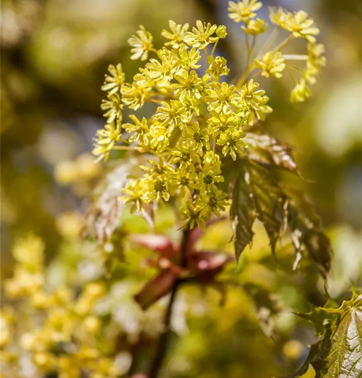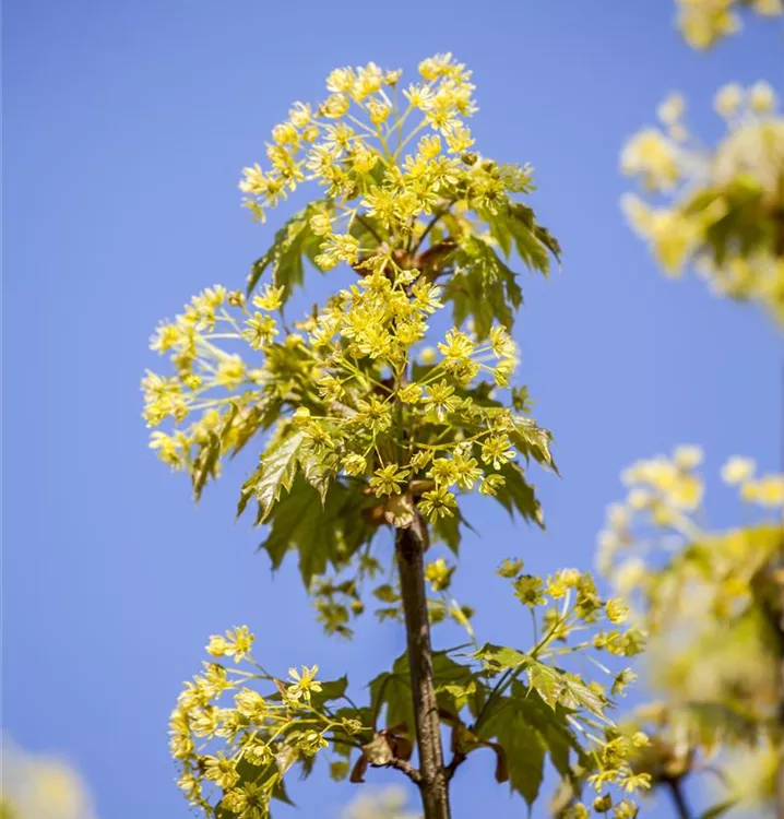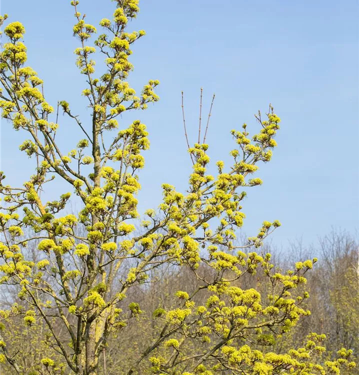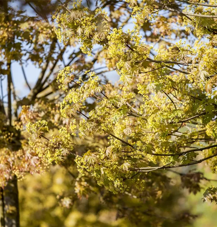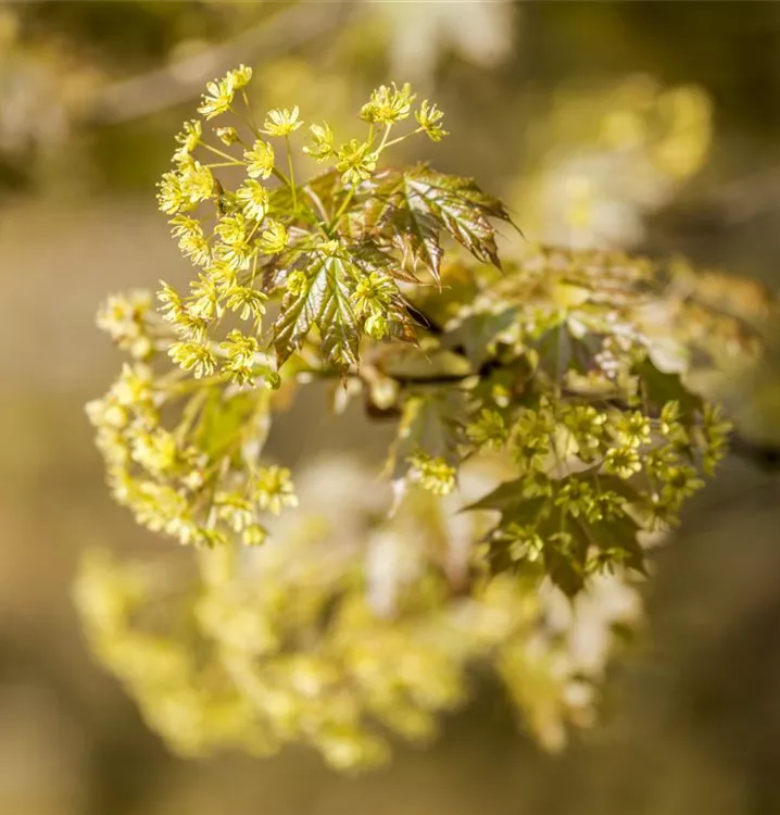 Die grüngelben Blüten des Spitzahorn erscheinen in Doldentrauben im April.