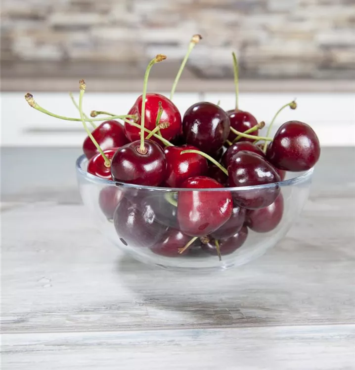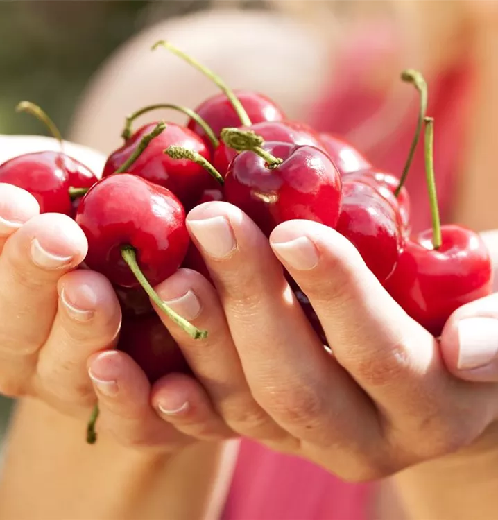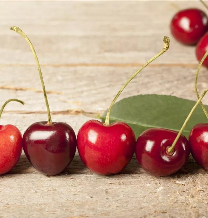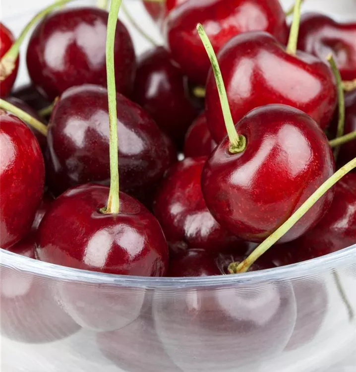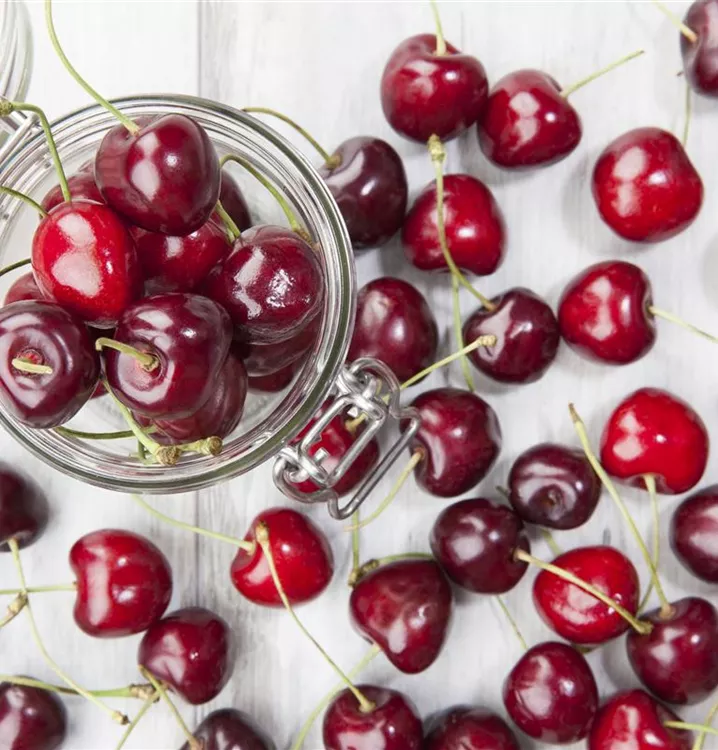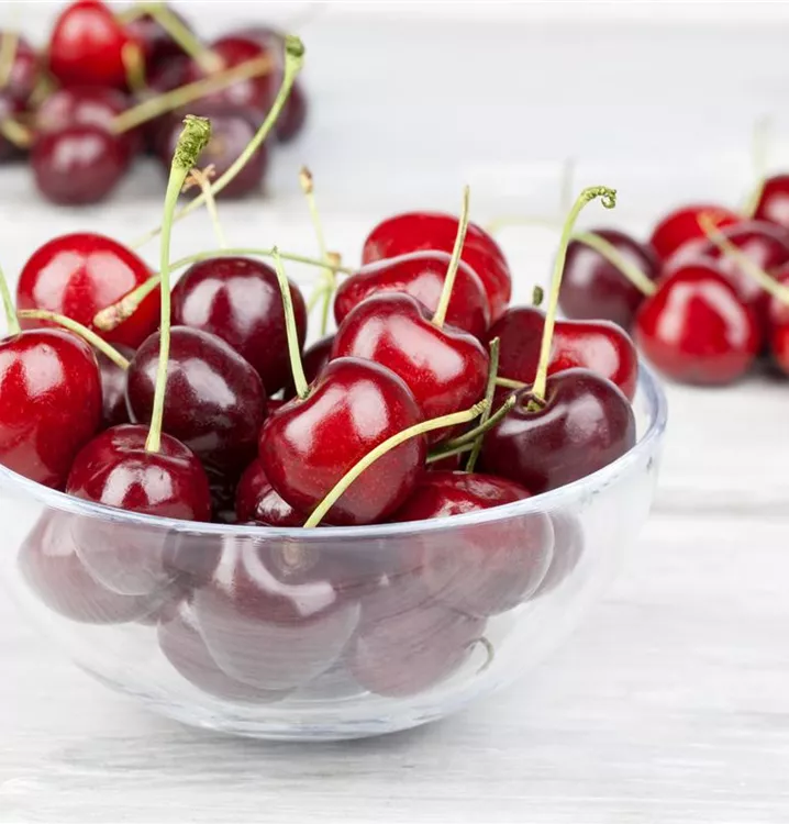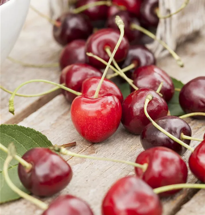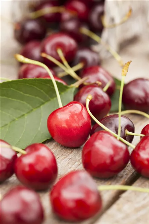 Die roten Steinfrüchte haben einen süßen, aromatischen Geschmack. Reifezeit ab Juni.