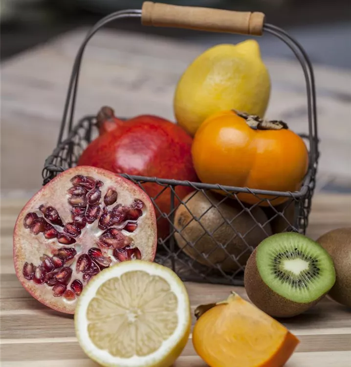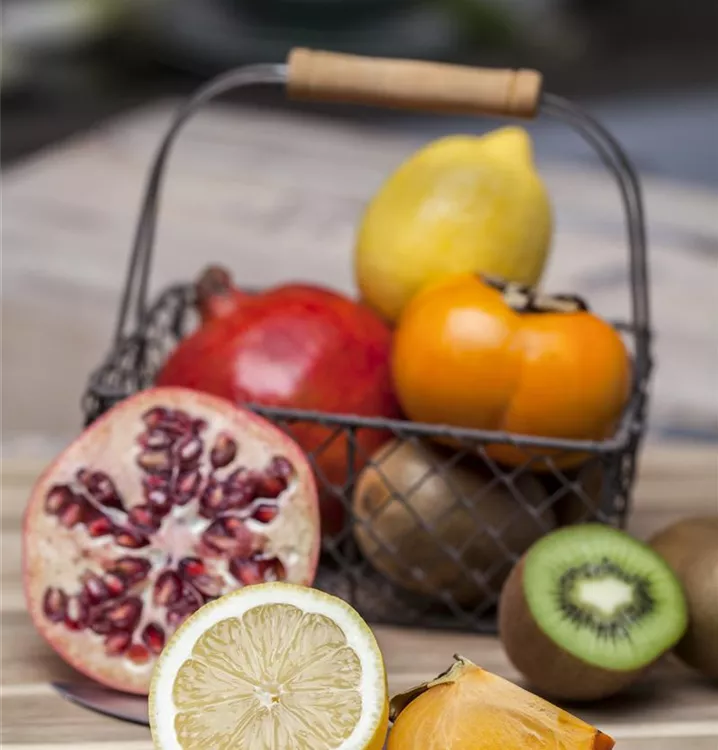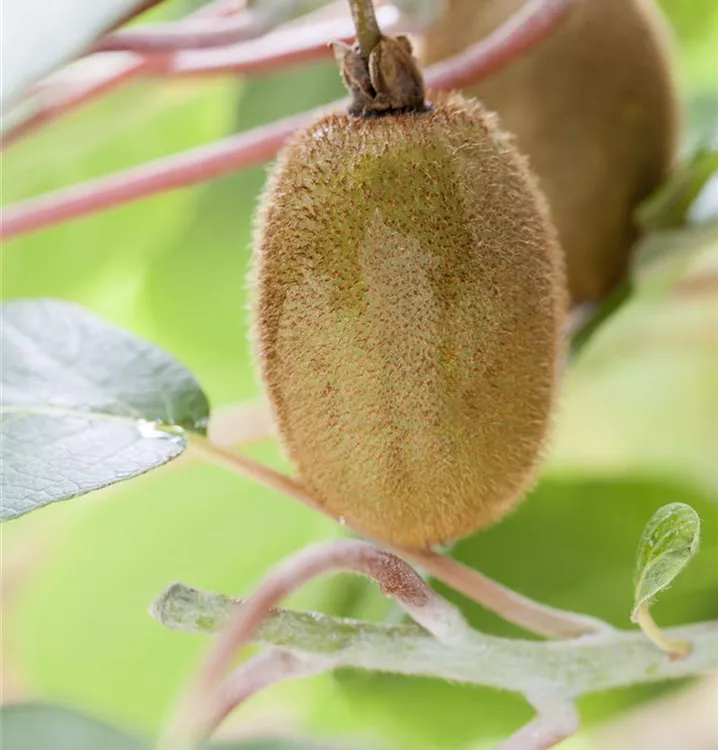 Die Kiwi (Actinidia chinensis) bildet braune Früchte. Sie sind oval und haben einen süß-säuerlichen Geschmack. Für eine ertragreiche Ernte ab September schaffen durchlässiger, humoser, kalkfreier, nährstoffreicher Boden und ein sonniger Standort optimale Bedingungen. Auch ihre cremeweißen Blüten sind eine schöne Erscheinung.
