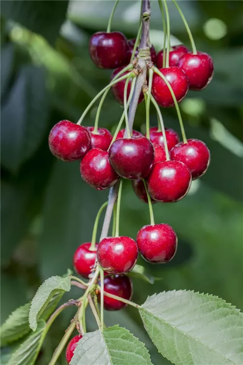 Die roten Früchte haben einen süß-säuerlichen Geschmack. Reifezeit ab Juli.