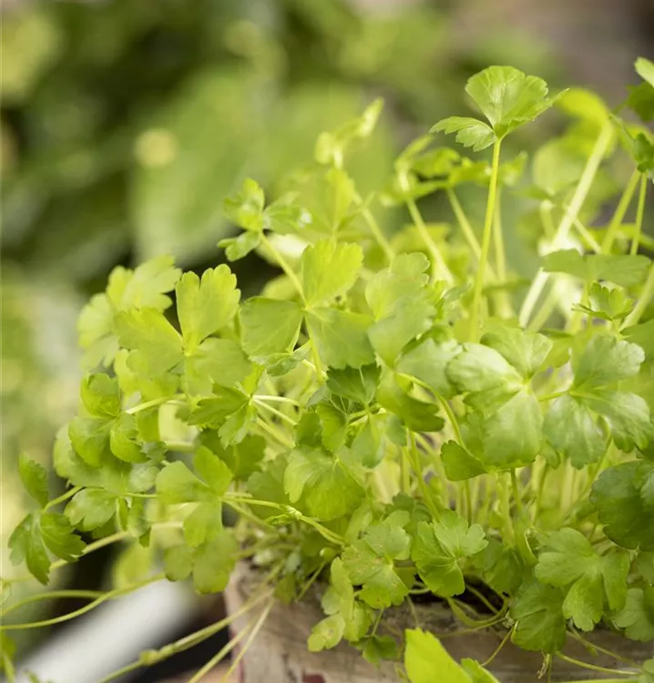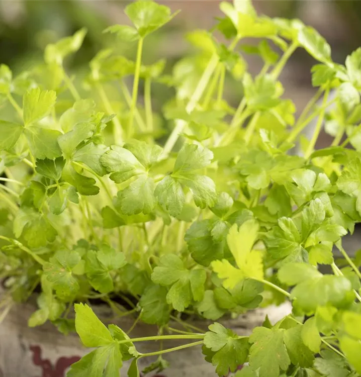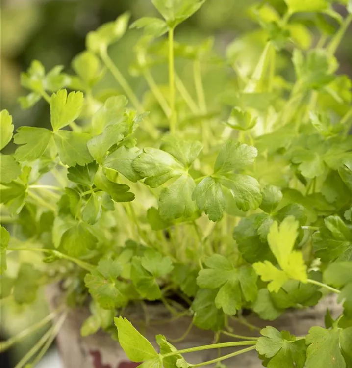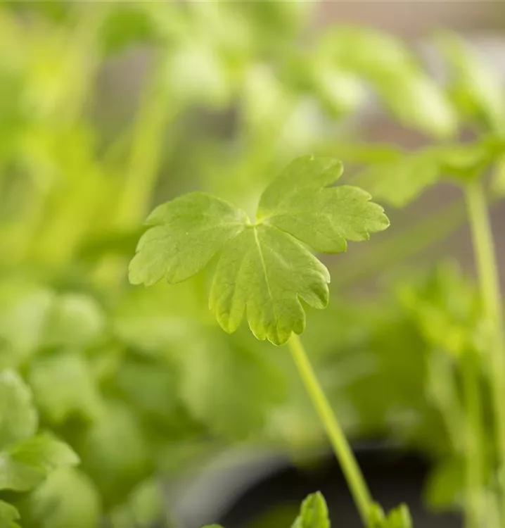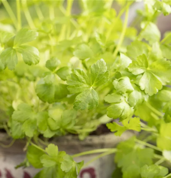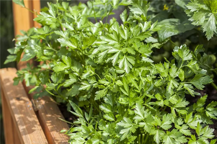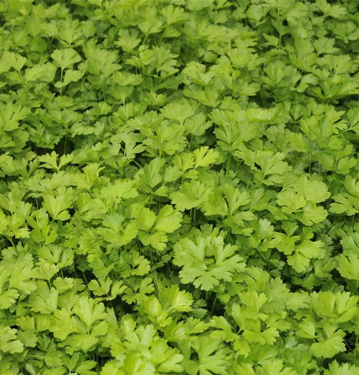 Ein wahres Multitalent wächst mit der Glatten Petersilie im Kräutergarten oder auch auf der Fensterbank. Nicht nur Speisen lassen sich mit der Glatten Petersilie verfeinern, auch der pharmazeutische Nutzen der zweijährigen Pflanze ist beachtlich. Petersilie wird am besten auf einem nährstoffreichen Lehmboden ausgesät. Die Wurzeln können bis 15 cm lang werden und lassen sich ebenfalls als Gewürzmittel verwenden. Gönnen Sie der Glatten Petersilie einen sonnigen Standort und halten die Erde gleichmäßig feucht, dann kann nach wenigen Wochen die Erntezeit beginnen.