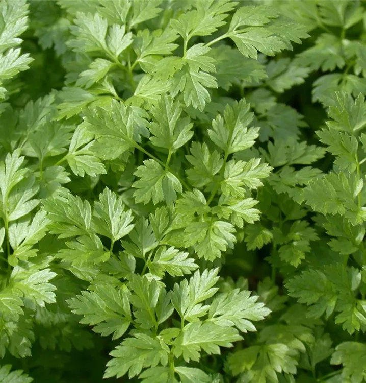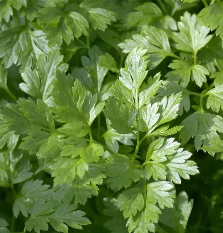 Zum Verzehr geeignet. Die dunkelgrünen, gesägten Blätter sind gefiedert und überzeugen mit aromatischem Geschmack.