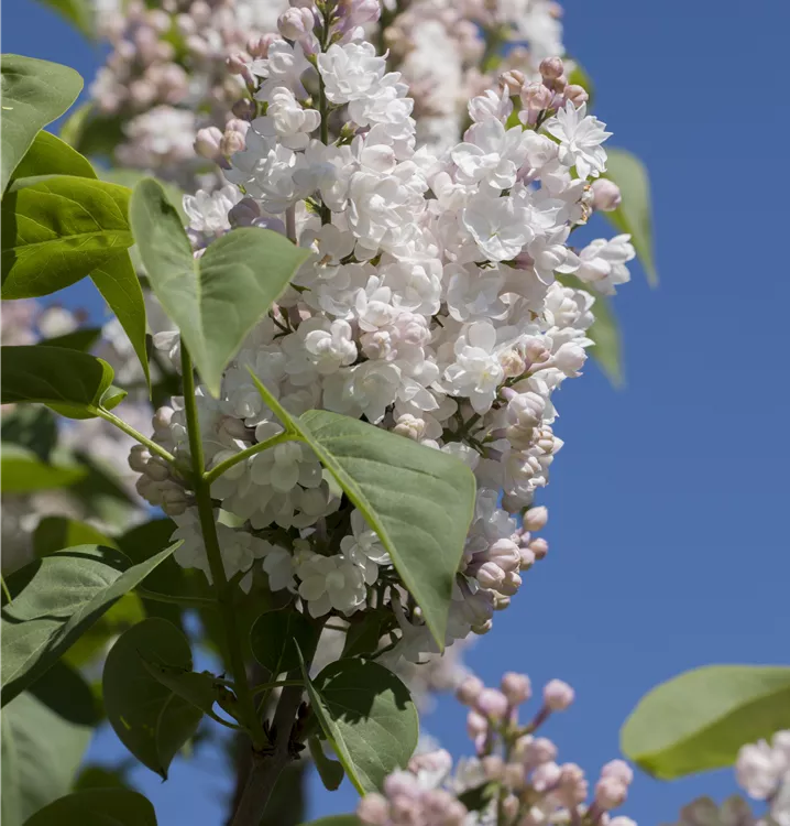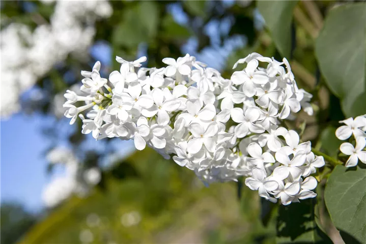 Die weißen Blüten des Edelflieder erscheinen in Rispen von Mai bis Juni. Diese werden etwa 12 - 15 cm groß und sind stark duftend.