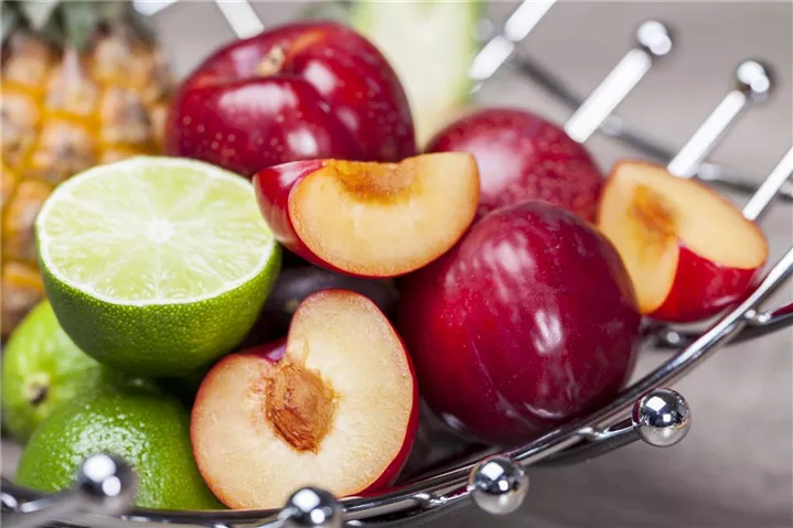 Die purpurvioletten Steinfrüchte haben einen süß-säuerlichen Geschmack. Reifezeit ab August.