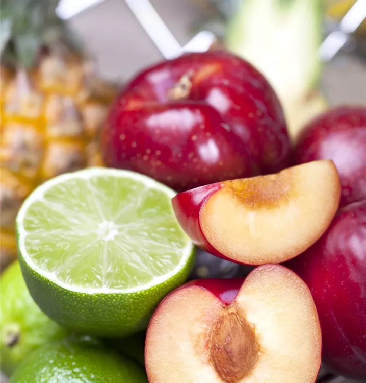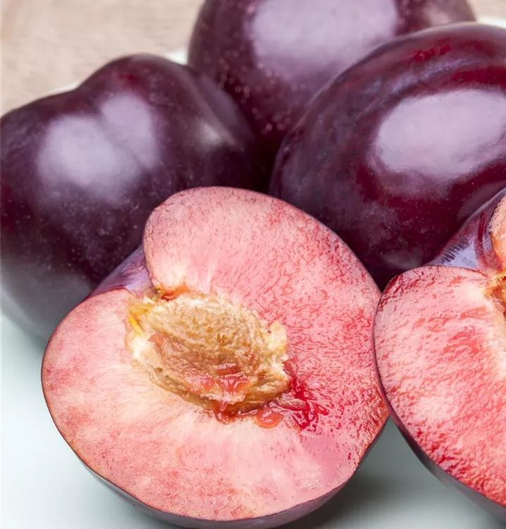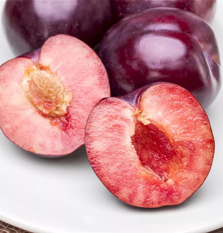 Die Pflaume (Prunus domestica) bildet purpurviolette Früchte. Sie haben einen süß-säuerlichen Geschmack. Für eine ertragreiche Ernte ab August schaffen durchlässiger, humoser Boden und ein sonniger bis halbschattiger Standort optimale Bedingungen. Auch ihre weißen Blüten sind eine schöne Erscheinung.