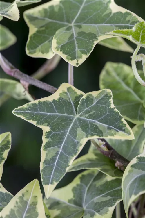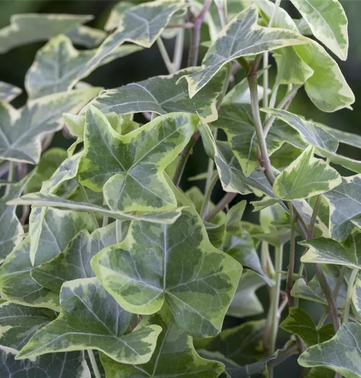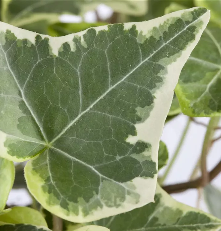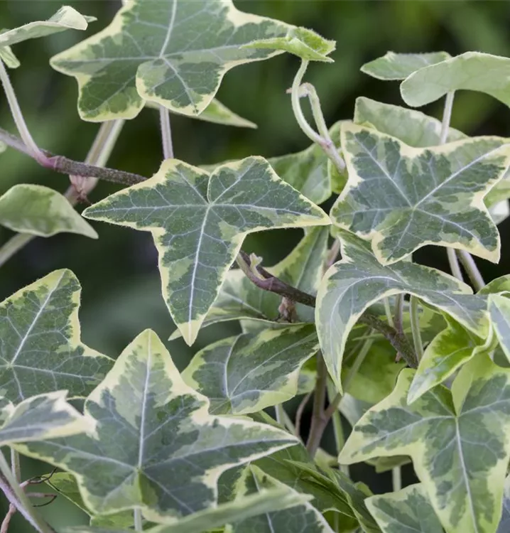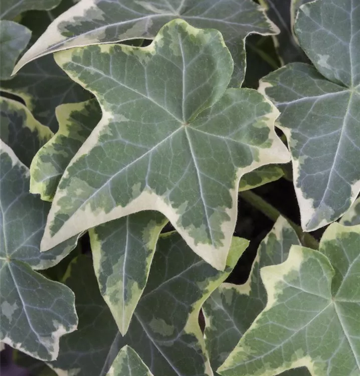 Hoher Blattschmuckwert. Die immergrünen Blätter des Gemeinen Efeus sind grün-weiß, herzförmig, ledrig, wechselständig, gelappt. Diese sind etwa 5 - 12 cm groß.