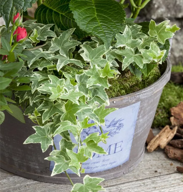 Hedera helix, grün-weiß ist ein Herzwurzler und bildet, je nach Boden, dicht verzweigte Wurzeln.