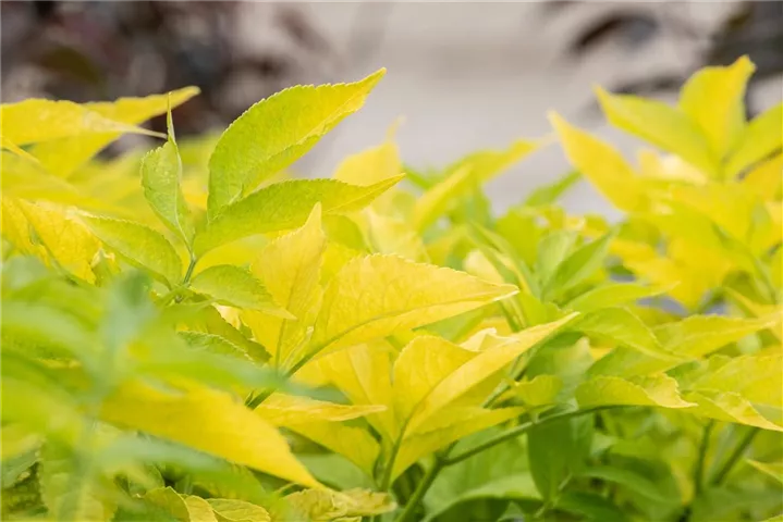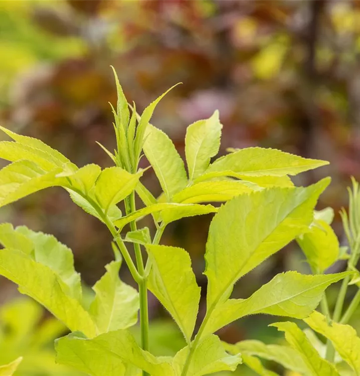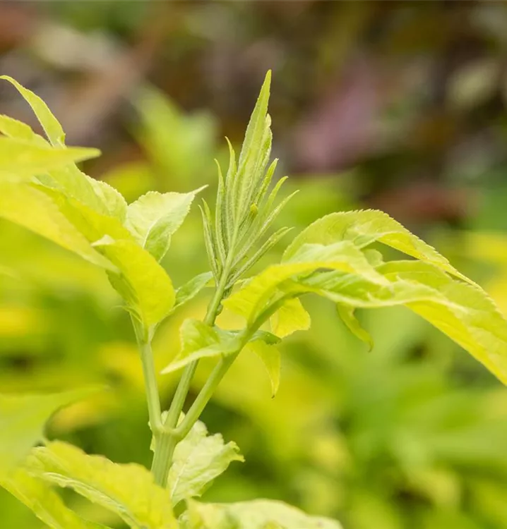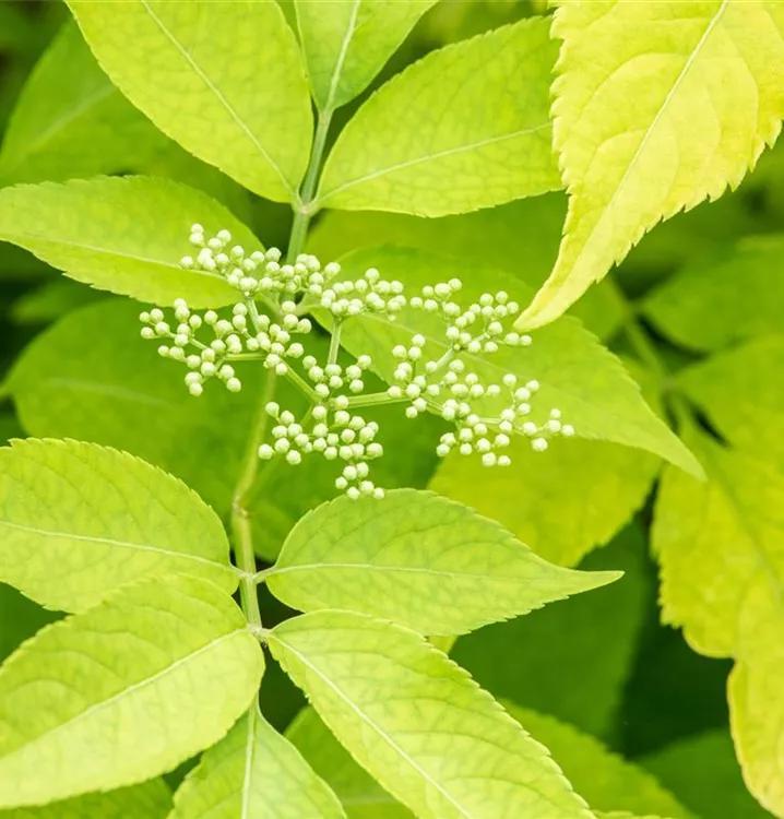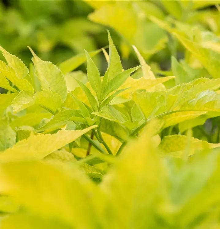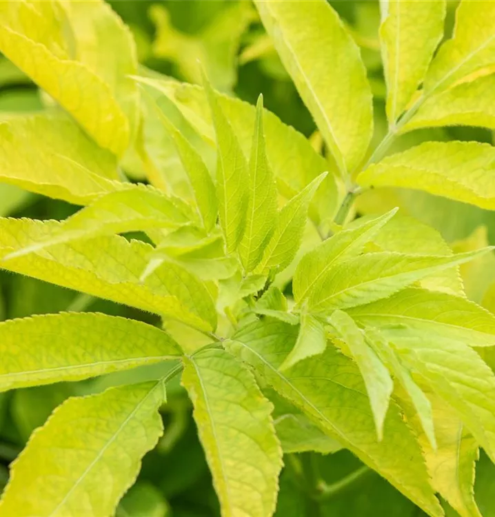 Hoher Blattschmuckwert. Die sommergrünen Blätter des Gelben Holunders sind gelb-grün. Diese sind etwa 20 - 30 cm groß.