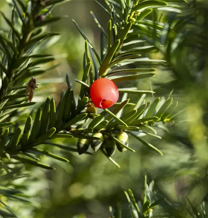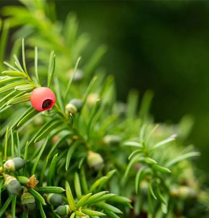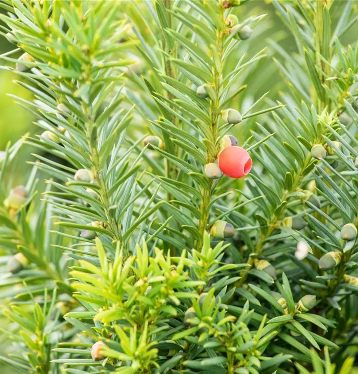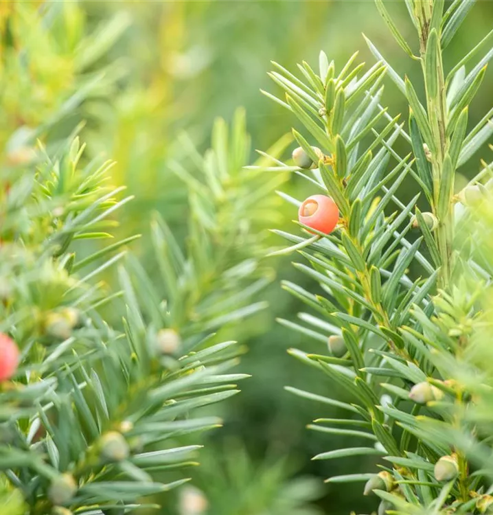 Besonders dekorativ sind die, beerenartigen Zapfen von Taxus x media 'Hicksii'. Diese erscheinen ab September.