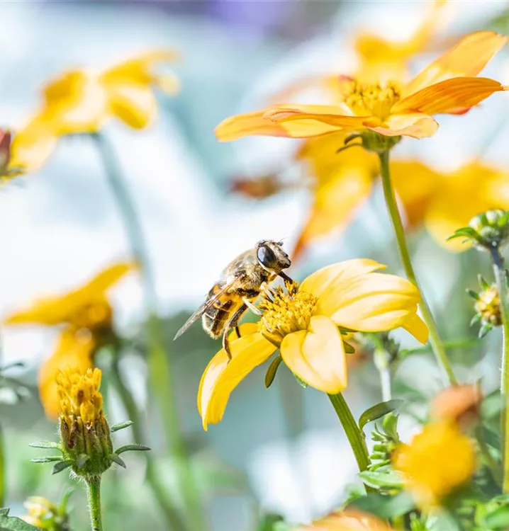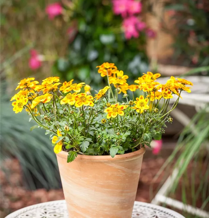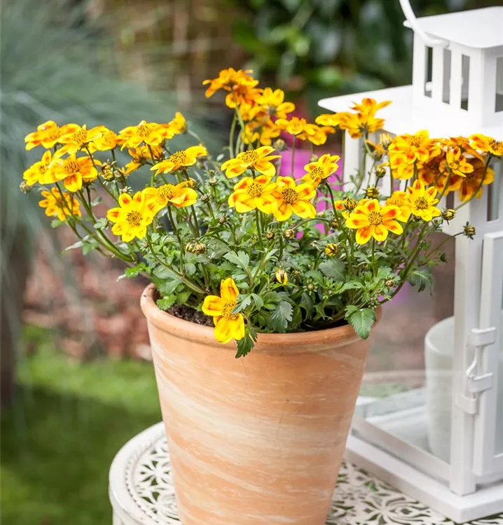 Die Goldmarie 'BeeDance'® (Bidens ferulifolia) ist eine beliebte Pflanze für den Balkon. Die unzähligen Blüten erscheinen, je nach Sorte, in verschiedenen Farben die ganze Saison hindurch. Ein sonniger Standort und ein durchlässiges Substrat werden bevorzugt.