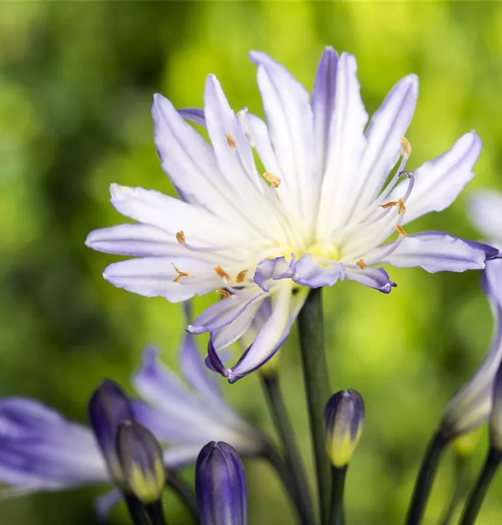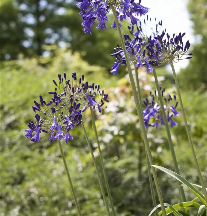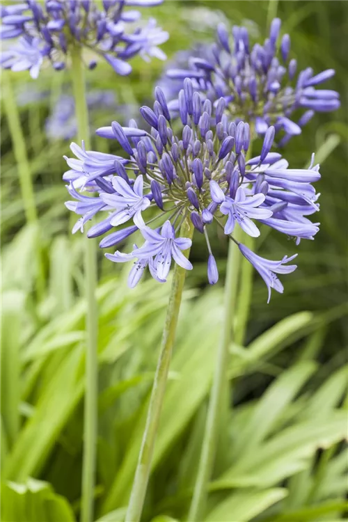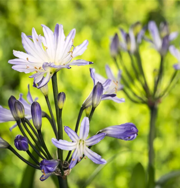 Die Schmucklilie (Agapanthus africanus) ist eine aufrechte Staude, die, je nach Sorte, sternförmige Blüten in verschiedenen Farben bildet. An einem sonnigen Standort mit durchlässigem, humosem Boden erreicht sie gewöhnlich eine Höhe von ca. 1,5 m und wird ca. 70 cm breit. Die Schmucklilie ist an geschützten Standorten gut frostverträglich.