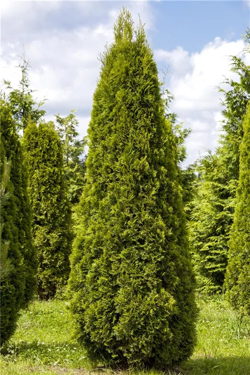Lebensbaum 'Smaragd' ist ein kegelförmig und schlank wachsender Großstrauch. Er erreicht gewöhnlich eine Höhe von 4 - 6 m und wird ca. 1 - 1,8 m breit. In der Regel wächst er 8 - 10 cm pro Jahr.