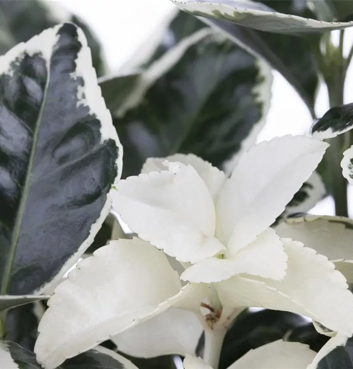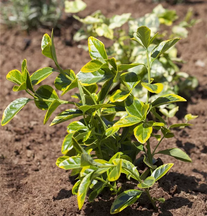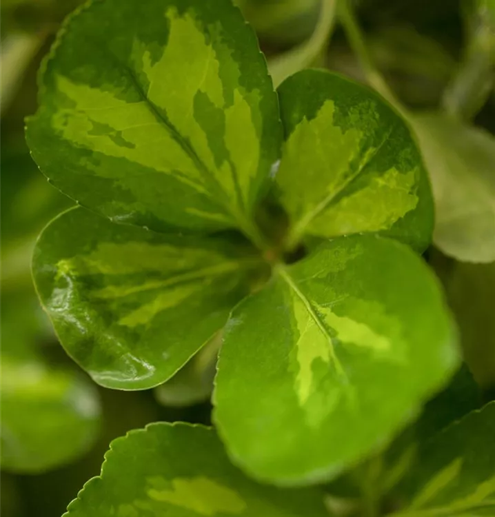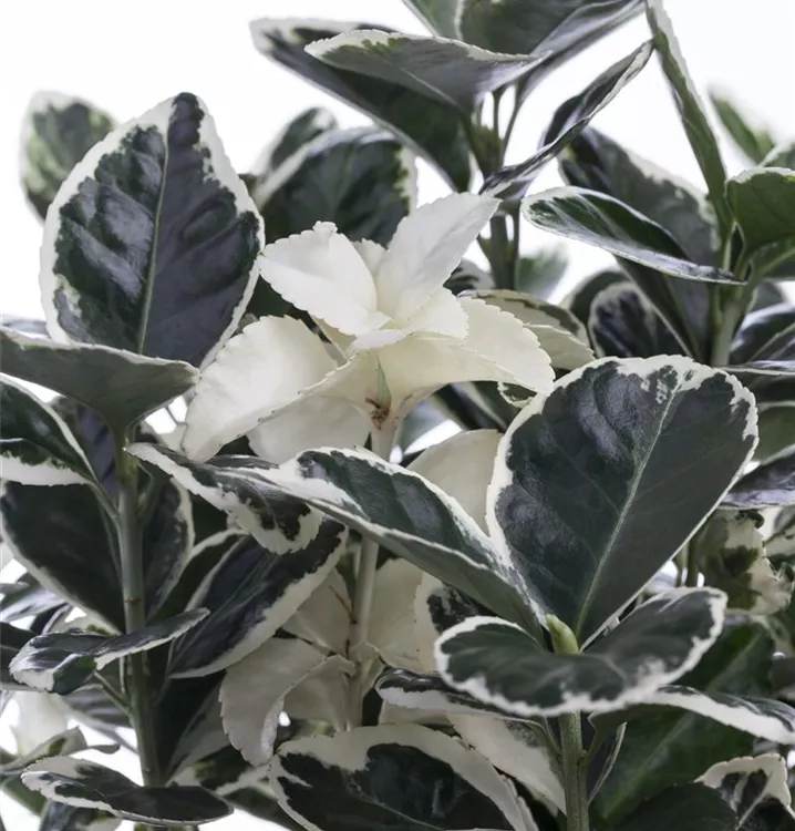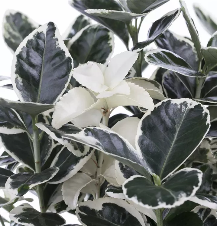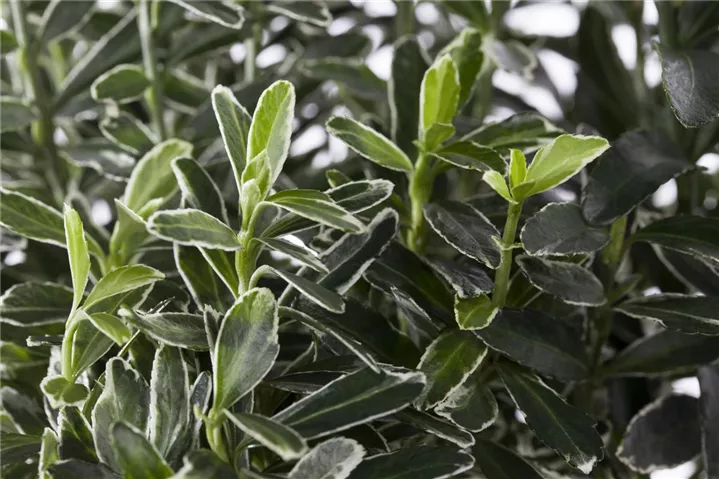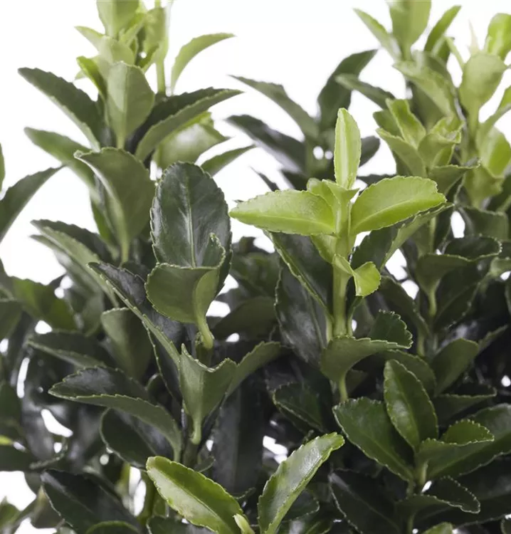 Die immergrünen Blätter der Immergrüne Japanspindel sind bunt, eiförmig, gesägt.