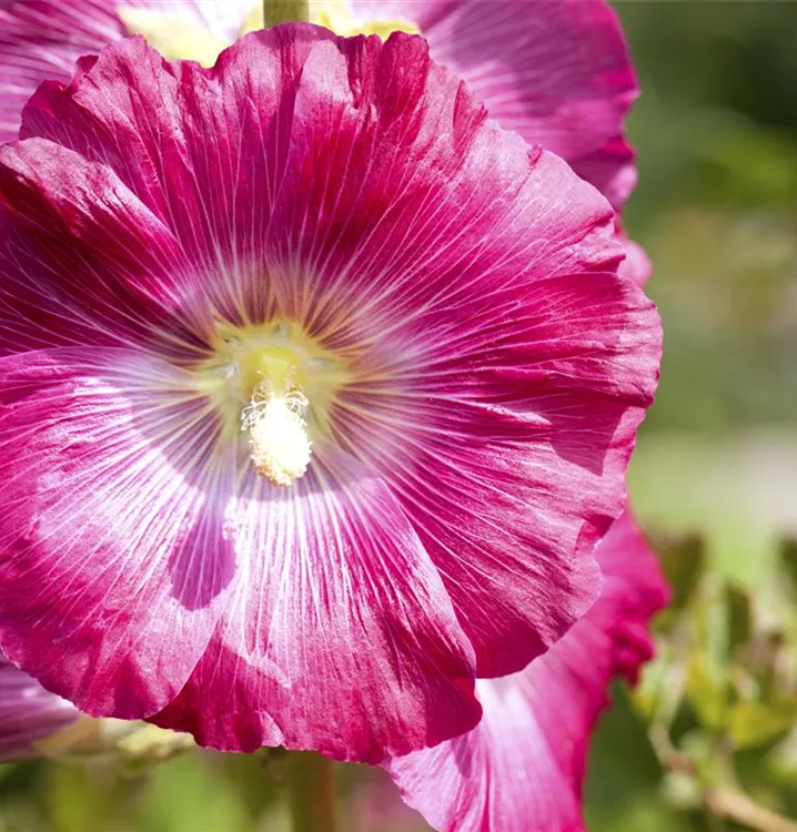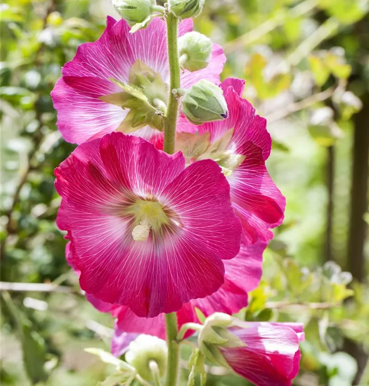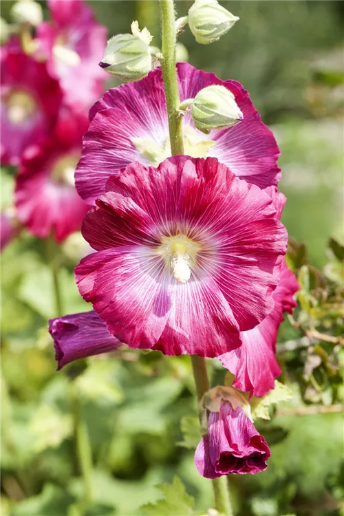 Die Stockrose (Alcea rosea) ist eine aufrechte, horstbildende Staude, die, je nach Sorte, schalenförmige Blüten in verschiedenen Farben bildet. An einem sonnigen Standort mit durchlässigem Boden erreicht sie gewöhnlich eine Höhe von ca. 1,8 m und wird ca. 60 cm breit. Die Stockrose ist gut frostverträglich.