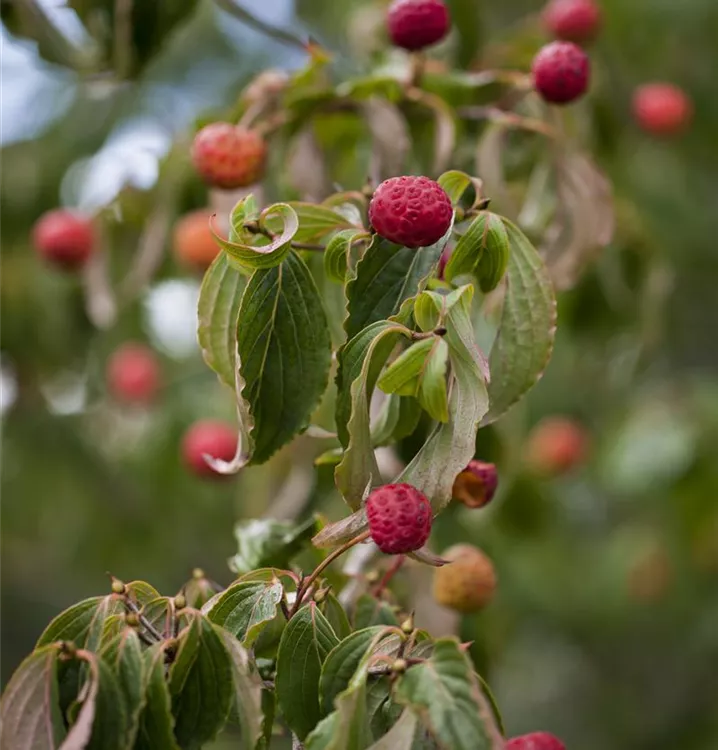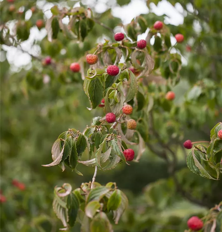 Besonders dekorativ sind die rosaroten, runden Beeren von Cornus kousa. Diese erscheinen ab September.