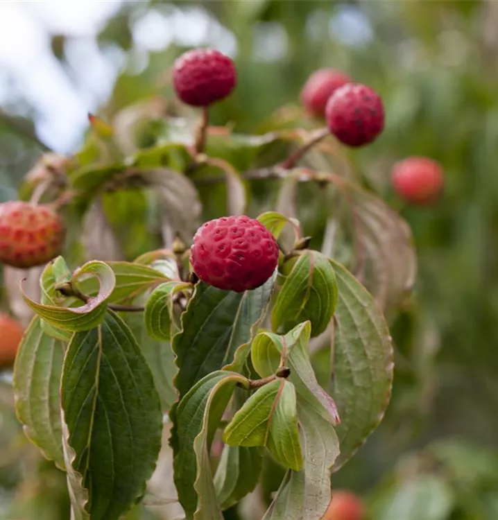Der Japanische Blumen-Hartriegel (Cornus kousa) ist ein aufrechter, ausladender Großstrauch mit dekorativen, rosaroten, runden Früchten. Die Blüten erscheinen je nach Sorte in verschiedenen Farben.