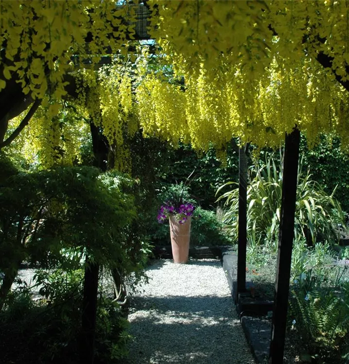 Der Goldregen (Laburnum watereri) eine trichterförmige Gartenpflanze, die, je nach Sorte, Blüten in verschiedenen Farben hervorbringt. An einem sonnigen bis halbschattigen, windgeschützten Standort mit durchlässigem, kalkhaltigem, nährstoffreichem Boden erreicht er gewöhnlich eine Höhe von ca. 8 m und wird ca. 6 m breit.