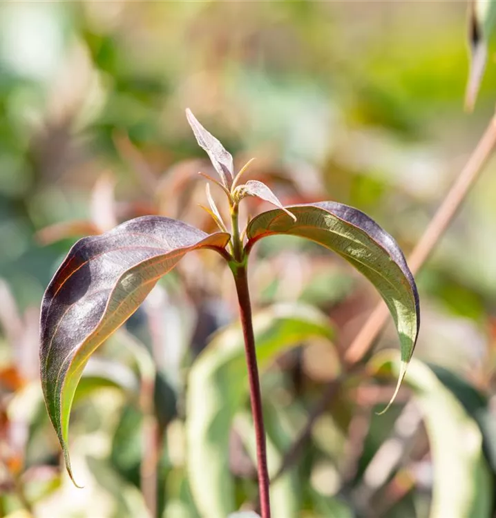 Der Japanische Blumen-Hartriegel 'Cappuccino'® (Cornus kousa) ist ein aufrechter, trichterförmiger Großstrauch mit dekorativen, runden Früchten. Die cremeweiß-rosafarbenen Blüten erscheinen von Ende Mai bis Juni. Auch der bordeauxrote Austrieb ist sehr schön.
