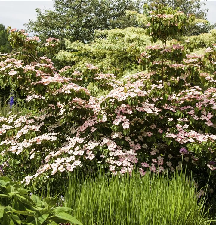 Der Japanische Blumen-Hartriegel 'Satomi'® (Cornus kousa) ist ein aufrechter Großstrauch mit dekorativen, dunkelrosafarbenen, runden Früchten. Die rosaroten Blüten erscheinen von Ende Mai bis Juni.