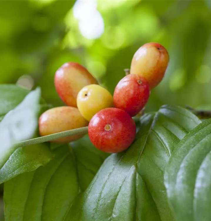 Besonders dekorativ sind die roten, ovalen Steinfrüchte von Cornus mas. Diese erscheinen ab August.