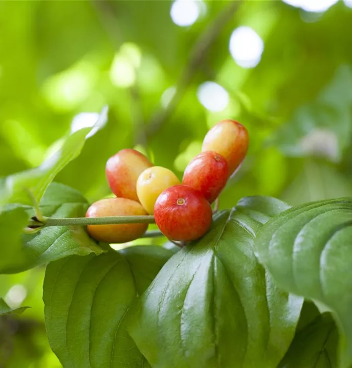 Die Kornelkirsche (Cornus mas) ist ein buschiger, aufrechter, breiter Großstrauch mit dekorativen, roten, ovalen Früchten. Die Blüten erscheinen je nach Sorte in verschiedenen Farben.