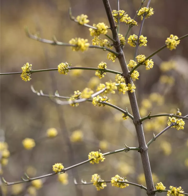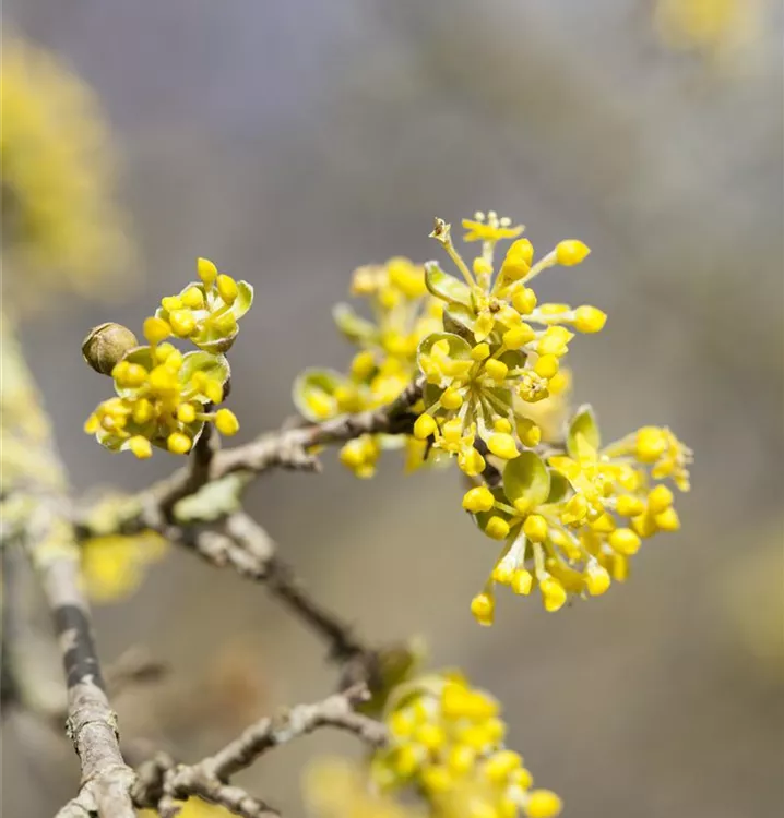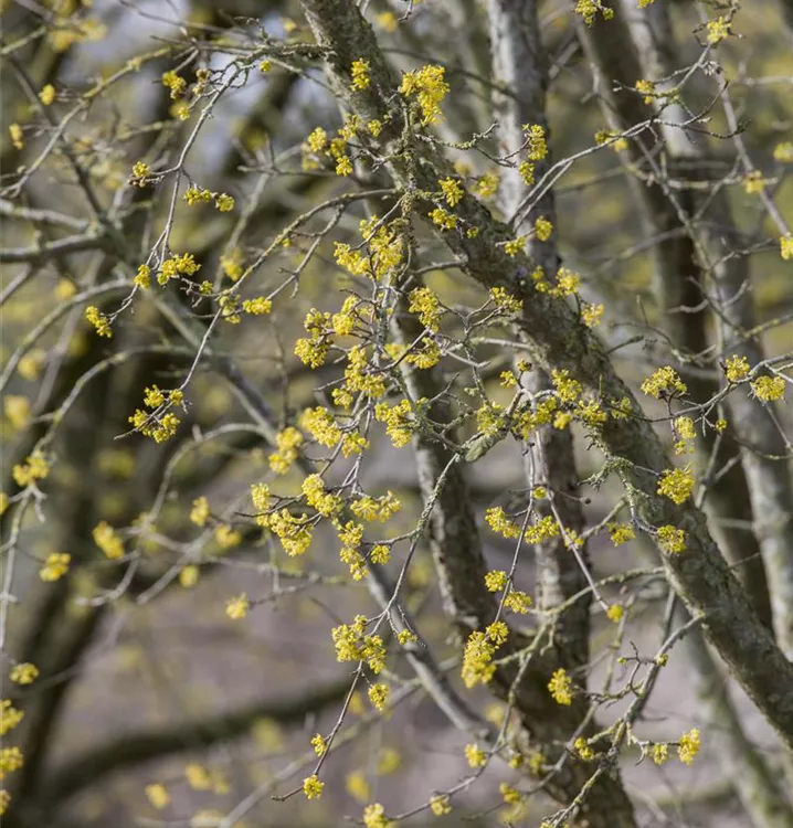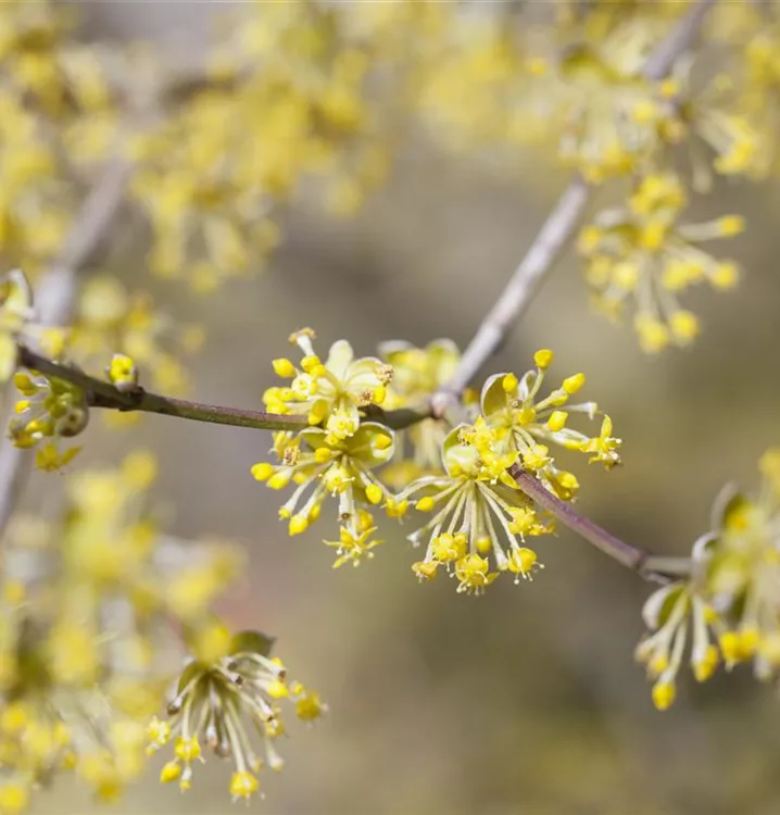 Die goldgelben Blüten der Kornelkirsche erscheinen in Dolden von März bis April. Diese sind leicht duftend.