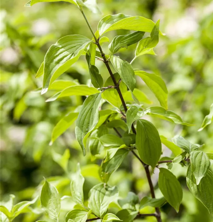Die sommergrünen Blätter der Kornelkirsche sind mittelgrün, eiförmig, gegenständig, gewellt. Diese sind etwa 4 - 10 cm groß. Kornelkirsche zeigt sich leuchtend orangegelb im Herbst.