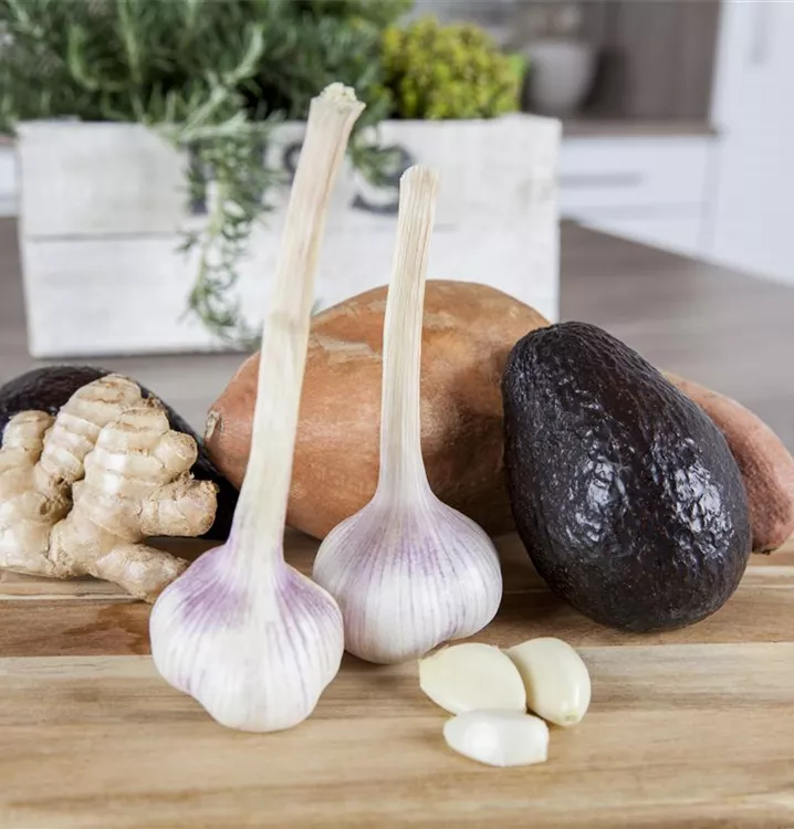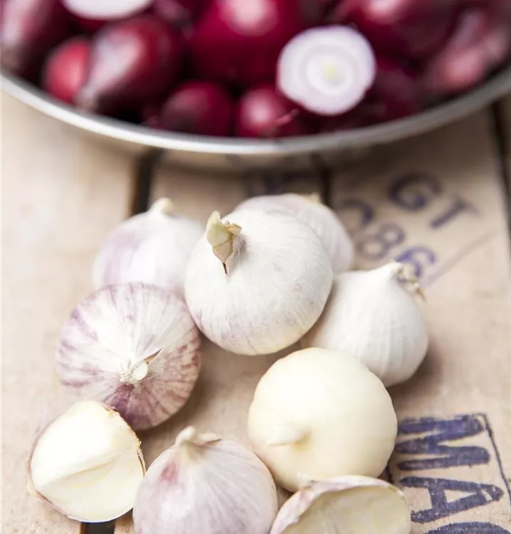 Der Echte Knoblauch (Allium sativum) bildet Zwiebeln, die pikant schmecken und bereits ab Juli geerntet werden können. Für das optimale Wachstum des Echten Knoblauchs werden ein sonniger Standort und durchlässiger, nährstoffreicher Boden benötigt.