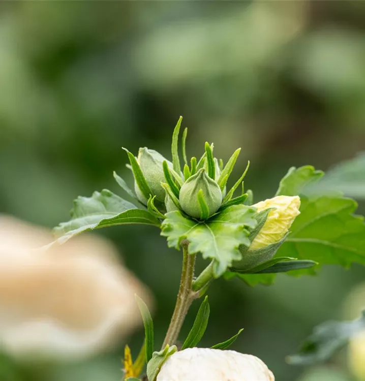 Die sommergrünen Blätter des Roseneibischs sind mittelgrün, eiförmig, wechselständig, gelappt. Roseneibisch zeigt sich leuchtend gelb im Herbst.