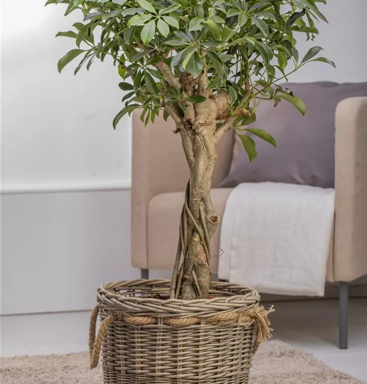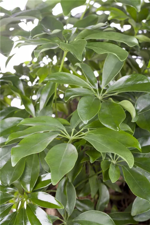 Die Strahlenaralie (Schefflera arboricola) trägt dunkelgrüne, handförmige Blätter. Diese strauchartige Pflanze gedeiht am besten an einem sonnigen bis halbschattigen Standort.