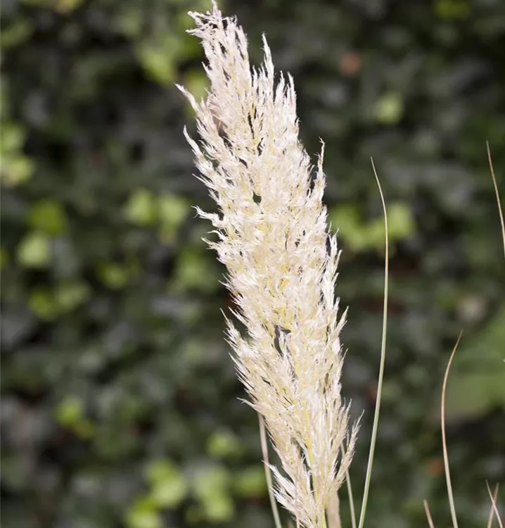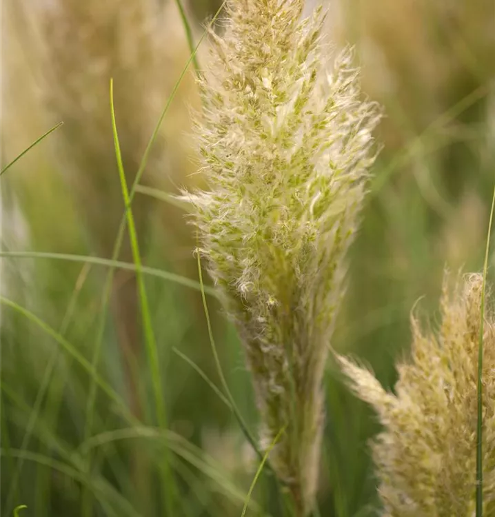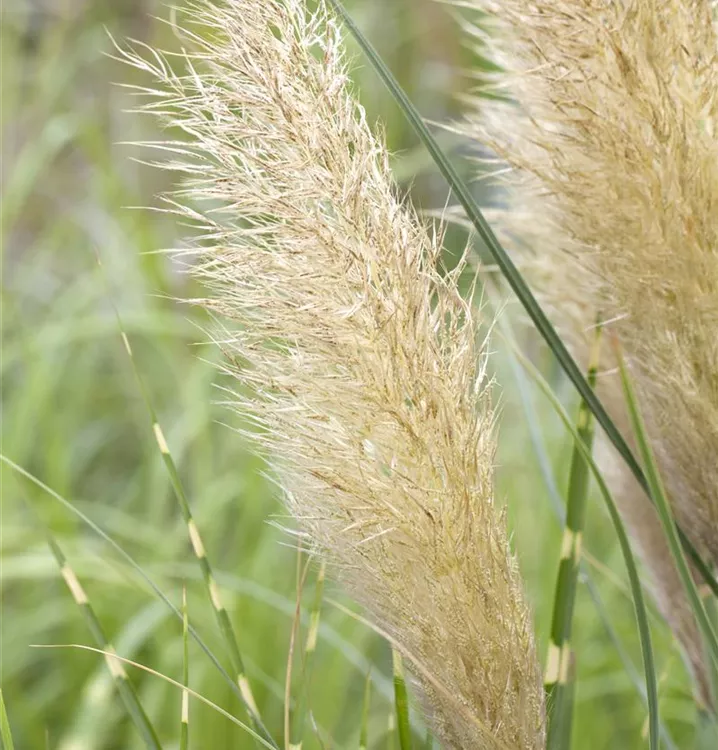 Das Pampasgras (Cortaderia selloana) ist mit seiner grau-grünen Blattfärbung ein dekoratives Gestaltungselement im Garten, welches sich an einem sonnigen Standort mit einem möglichst durchlässigen, humosen, nährstoffreichen Boden am wohlsten fühlt. Die weißen Blütenwedel schmücken die ausladend wachsende Pflanze ab Herbst. Bei günstigen Bedingungen erreicht dieses winterharte Gras eine Höhe von ca. 1,5 m und wird bis zu 1,5 m breit.