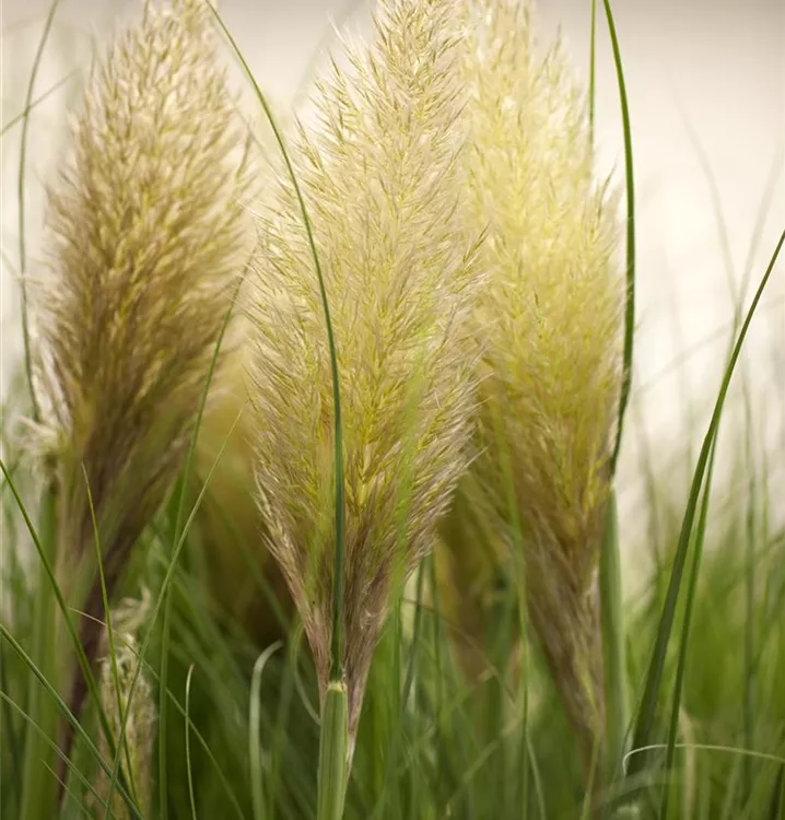 Die wintergrünen Blätter des Pampasgrases sind grau-grün, lineal.